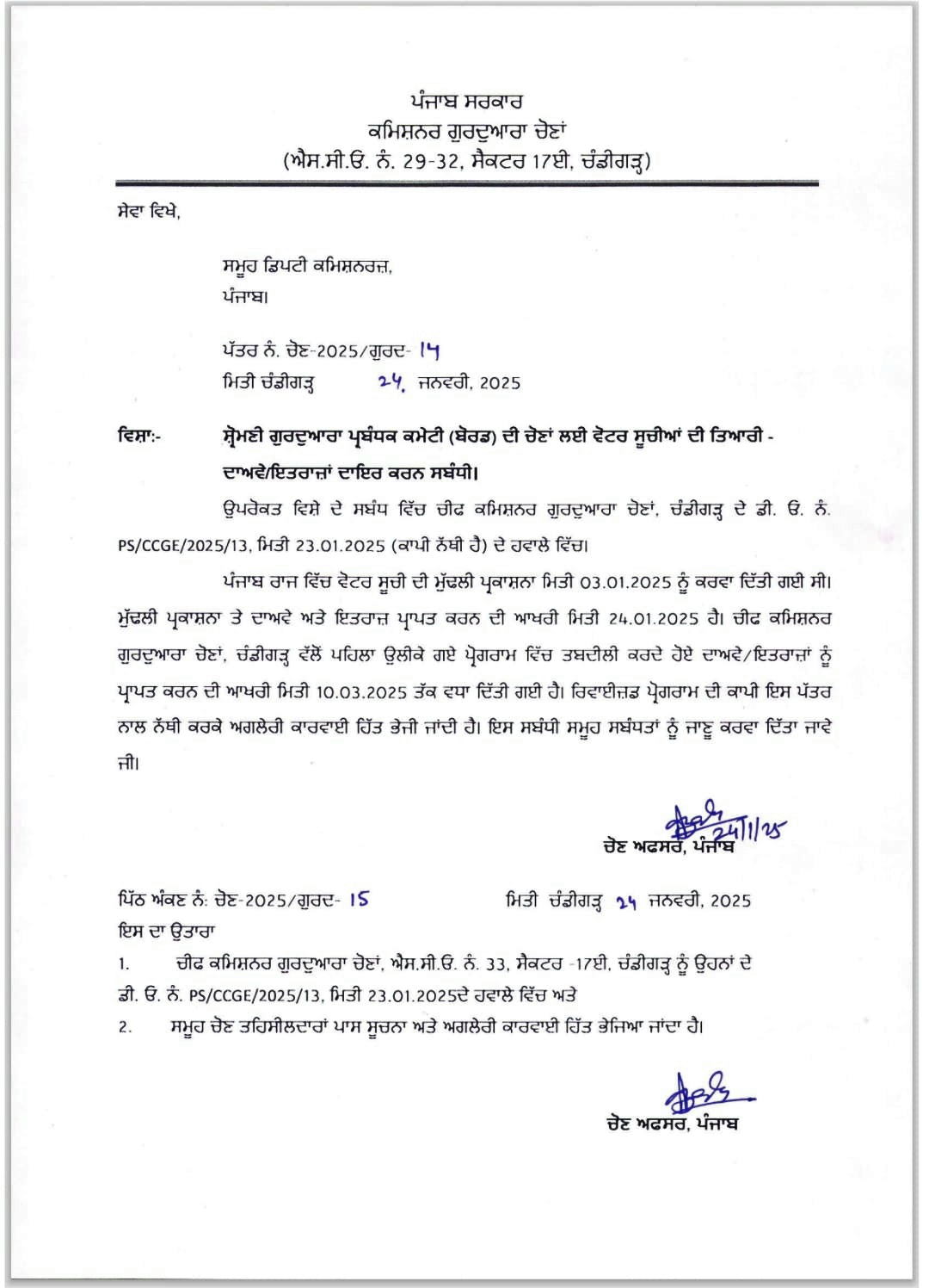 SGPC ਵੋਟਾਂ ਸਬੰਧੀ ਇਤਰਾਜ਼ ਦਰਜ ਕਰਵਾਉਣ ਦੀ ਤਾਰੀਕ 10 ਮਾਰਚ 2025 ਤੱਕ ਵਧੀ – ਵੋਟਰ ਲਿਸਟ ਦਾ ਅੰਤਿਮ ਪ੍ਰਕਾਸ਼ਨ 16 ਅਪ੍ਰੈਲ – ਪੜ੍ਹੋ ਚੀਫ ਕਮਿਸ਼ਨਰ ਗੁਰਦੁਆਰਾ ਚੋਣਾਂ ਵੱਲੋਂ ਜਾਰੀ ਪੱਤਰ