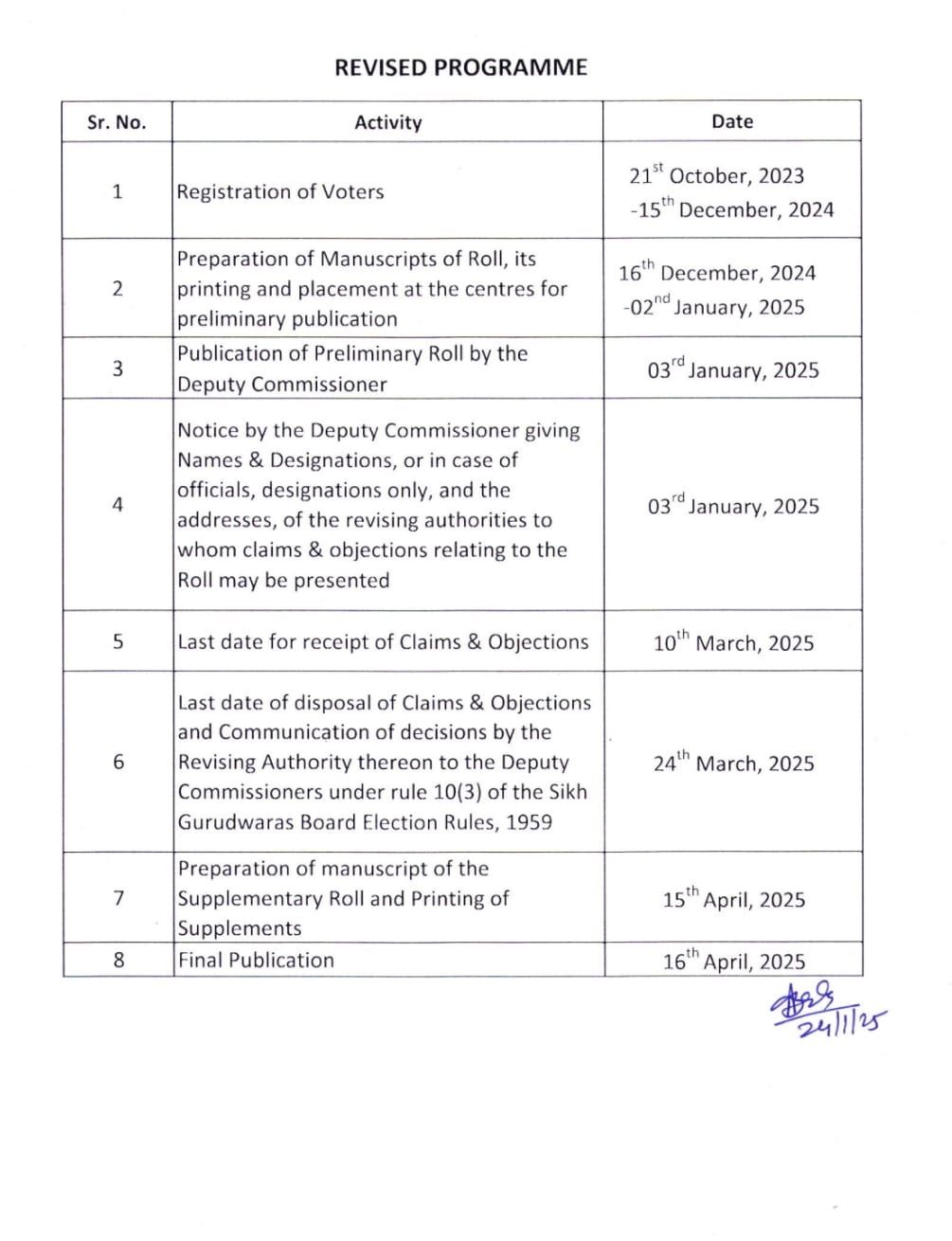 ਪੰਜਾਬ ਰਾਜ ਵਿੱਚ ਵੋਟਰ ਸੂਚੀ ਦੀ ਮੁੱਢਲੀ ਪ੍ਰਕਾਸ਼ਨਾ ਮਿਤੀ 03.01.2025 ਨੂੰ ਕਰਵਾ ਦਿੱਤੀ ਗਈ ਸੀ। ਮੁੱਢਲੀ ਪ੍ਰਕਾਸ਼ਨਾ ਤੇ ਦਾਅਵੇ ਅਤੇ ਇਤਰਾਜ਼ ਪ੍ਰਾਪਤ ਕਰਨ ਦੀ ਆਖਰੀ ਮਿਤੀ 24.01.2025 ਹੈ। ਚੀਫ ਕਮਿਸ਼ਨਰ ਗੁਰਦੁਆਰਾ ਚੋਣਾਂ, ਚੰਡੀਗੜ੍ਹ ਵੱਲੋਂ ਪਹਿਲਾ ਉਲੀਕੇ ਗਏ ਪ੍ਰੋਗਰਾਮ ਵਿੱਚ ਤਬਦੀਲੀ ਕਰਦੇ ਹੋਏ ਦਾਅਵੇ/ਇਤਰਾਜ਼ਾਂ ਨੂੰ ਪ੍ਰਾਪਤ ਕਰਨ ਦੀ ਆਖਰੀ ਮਿਤੀ 10.03.2025 ਤੱਕ ਵਧਾ ਦਿੱਤੀ ਗਈ ਹੈ।