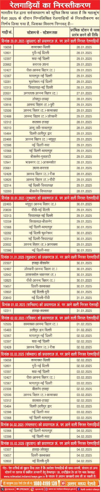 ” ਭਾਰਤੀ ਰੇਲਵੇ ਆਮ ਜਨਤਾ ਨੂੰ ਸੂਚਿਤ ਕਰਦਾ ਹੈ ਕਿ ਮਹਾਂਕੁੰਭ ਮੇਲਾ 2025 ਦੌਰਾਨ ਹੇਠ ਲਿਖੀਆਂ ਰੇਲਗੱਡੀਆਂ ਨੂੰ ਰੱਦ ਕਰਨ ਦਾ ਫੈਸਲਾ ਕੀਤਾ ਗਿਆ ਹੈ, ਜਿਨ੍ਹਾਂ ਦੇ ਵੇਰਵੇ ਹੇਠ ਲਿਖੇ ਅਨੁਸਾਰ ਹਨ:-