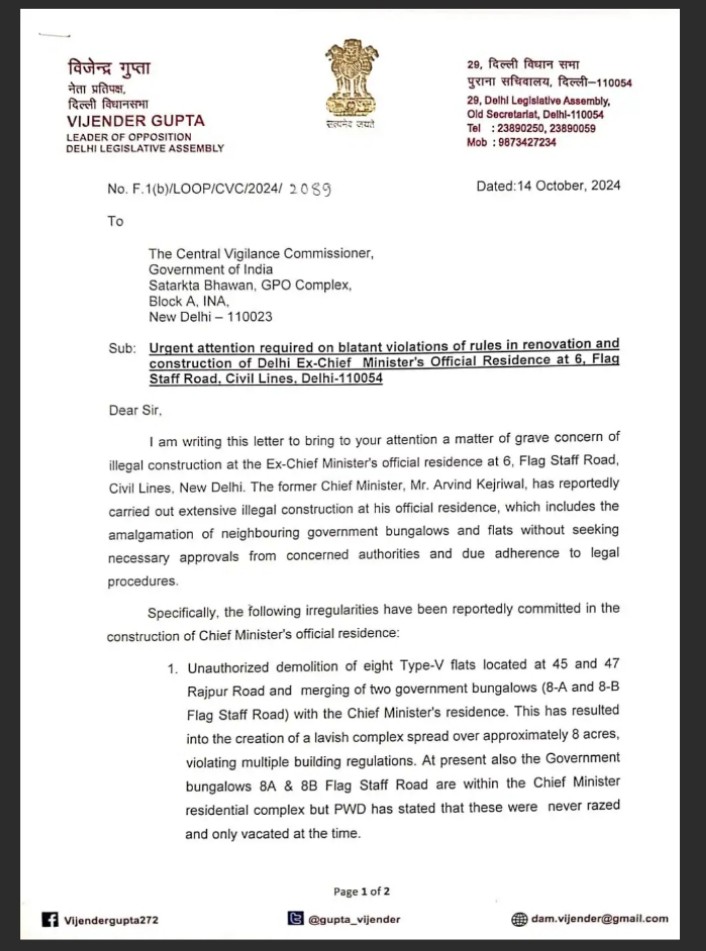 ਉਪ ਰਾਜਪਾਲ ਨੂੰ ਲਿਖੇ ਆਪਣੇ ਪੱਤਰ ਵਿੱਚ, ਵਿਜੇਂਦਰ ਗੁਪਤਾ ਨੇ ਦੋਸ਼ ਲਗਾਇਆ ਸੀ ਕਿ ਦਿੱਲੀ ਦੇ ਸਾਬਕਾ ਮੁੱਖ ਮੰਤਰੀ ਅਰਵਿੰਦ ਕੇਜਰੀਵਾਲ ਨੇ ਜਨਤਕ ਪੈਸੇ ਦੀ ਵਰਤੋਂ ਕਰਕੇ ਆਪਣੀ ਸਰਕਾਰੀ ਰਿਹਾਇਸ਼ ਨੂੰ ਸ਼ੀਸ਼ ਮਹਿਲ ਵਿੱਚ ਬਦਲ ਦਿੱਤਾ, ਜੋ ਕਿ ਪੂਰੀ ਤਰ੍ਹਾਂ ਗੈਰ-ਕਾਨੂੰਨੀ ਅਤੇ ਅਨੈਤਿਕ ਸੀ। ਅਜਿਹੀ ਸਥਿਤੀ ਵਿੱਚ, ਜਾਇਦਾਦ ਨੂੰ ਇਸਦੀ ਅਸਲ ਸਥਿਤੀ ਵਿੱਚ ਬਹਾਲ ਕੀਤਾ ਜਾਣਾ ਚਾਹੀਦਾ ਹੈ ਅਤੇ ਨੇੜਲੇ ਸਰਕਾਰੀ ਜਾਇਦਾਦਾਂ ‘ਤੇ ਕਬਜ਼ੇ ਬਿਨਾਂ ਦੇਰੀ ਕੀਤੇ ਹਟਾਏ ਜਾਣੇ ਚਾਹੀਦੇ ਹਨ।