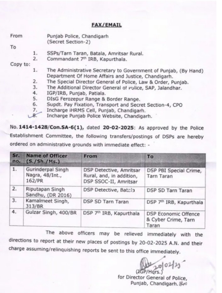 ਮੁੱਖ ਖ਼ਬਰਾਂ ਪੰਜਾਬ ਪੁਲਿਸ’ ਚ ਤਬਾਦਲੇ… ਪੜ੍ਹੋ ਸੂਚੀ February 20, 2025 ਨਿਊਜ਼ ਪੰਜਾਬ ਚੰਡੀਗੜ੍ਹ, 20 ਫਰਵਰੀ, 2025 ਪੰਜਾਬ ਵਿੱਚ ਇੱਕ ਆਈਪੀਐਸ ਅਤੇ ਚਾਰ ਡੀਐਸਪੀਜ਼ ਦੇ ਤਬਾਦਲੇ ਕੀਤੇ ਗਏ ਹਨ।
