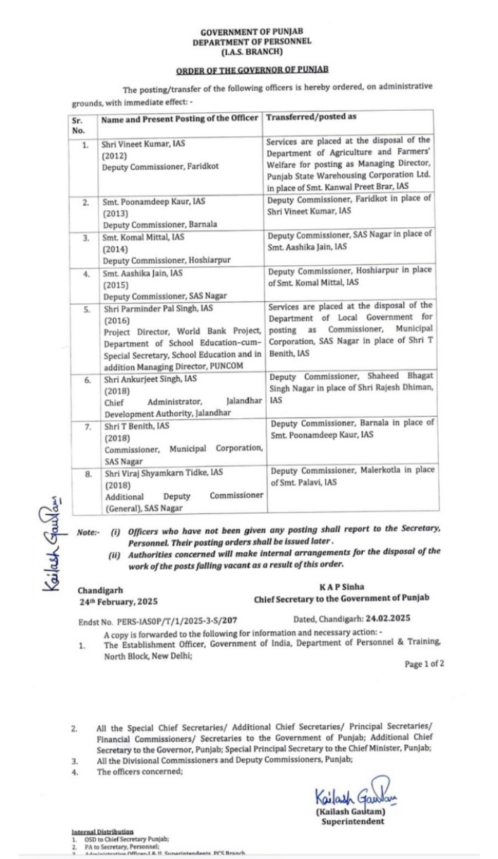 ਪੰਜਾਬ ਸਰਕਾਰ ਨੇ ਛੇ ਡਿਪਟੀ ਕਮਿਸ਼ਨਰਾਂ ਸਮੇਤ ਅੱਠ ਆਈਏਐਸ ਅਧਿਕਾਰੀਆਂ ਦਾ ਤਬਾਦਲਾ ਕਰ ਦਿੱਤਾ।ਇੱਕ ਹੁਕਮ ਅਨੁਸਾਰ, ਕੋਮਲ ਮਿੱਤਲ ਨੂੰ ਮੋਹਾਲੀ ਦੇ ਡਿਪਟੀ ਕਮਿਸ਼ਨਰ ਵਜੋਂ ਤਾਇਨਾਤ ਕੀਤਾ ਗਿਆ ਹੈ, ਜੋ ਕਿ ਆਸ਼ਿਕਾ ਜੈਨ ਦੀ ਥਾਂ ‘ਤੇ ਹੈ, ਜੋ ਹੁਸ਼ਿਆਰਪੁਰ ਨੂੰ ਡਿਪਟੀ ਕਮਿਸ਼ਨਰ ਵਜੋਂ ਜਾਂਦੀ ਹੈ।