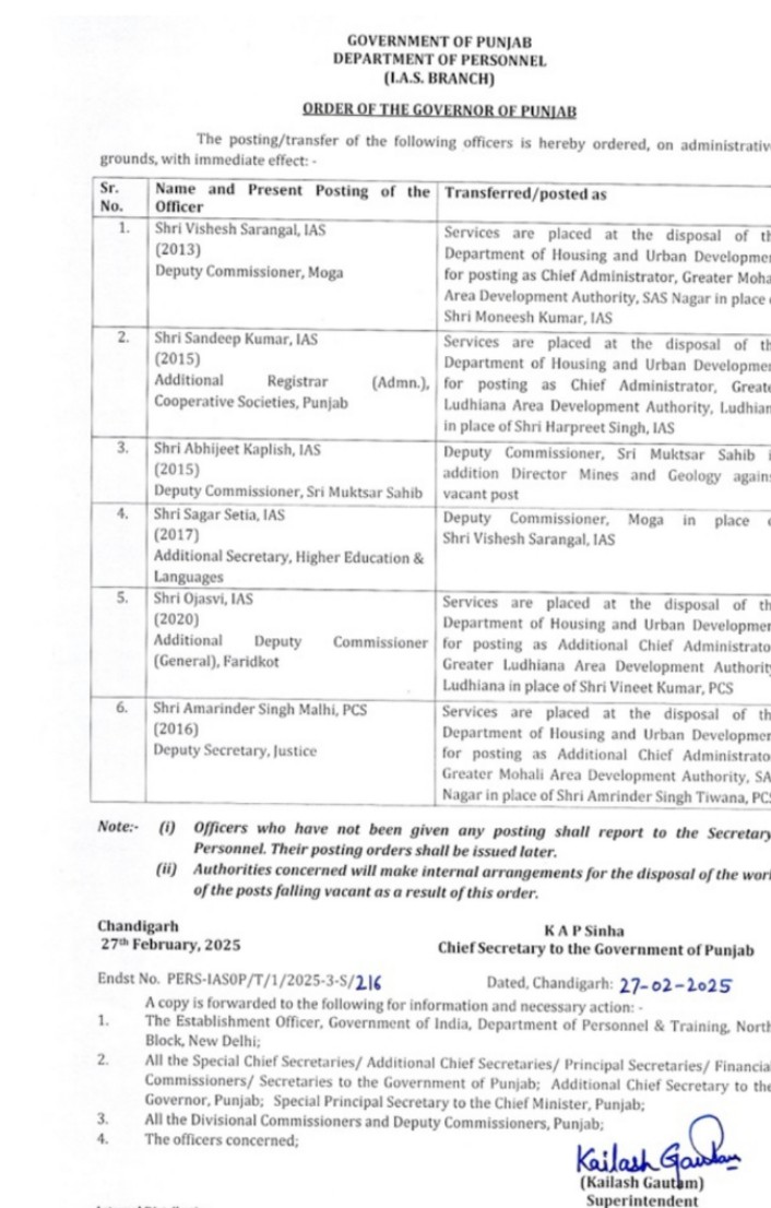 ਪੰਜਾਬ, ਮੁੱਖ ਖ਼ਬਰਾਂ ਪੰਜਾਬ ਸਰਕਾਰ ਨੇ ਇੱਕ ਡਿਪਟੀ ਕਮਿਸ਼ਨਰ ਸਮੇਤ 5 IAS ਤੇ 1 PCS ਅਫ਼ਸਰਾ ਦਾ ਕੀਤਾ ਤਬਾਦਲਾ February 27, 2025 ਨਿਊਜ਼ ਪੰਜਾਬ,27 ਫਰਵਰੀ 2025 ਪੰਜਾਬ ਸਰਕਾਰ ਨੇ ਇੱਕ ਡਿਪਟੀ ਕਮਿਸ਼ਨਰ ਸਮੇਤ 5 IAS ਤੇ 1 PCS ਅਫ਼ਸਰ ਬਦਲੇ