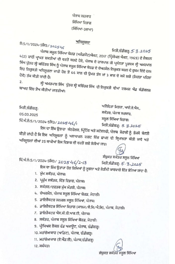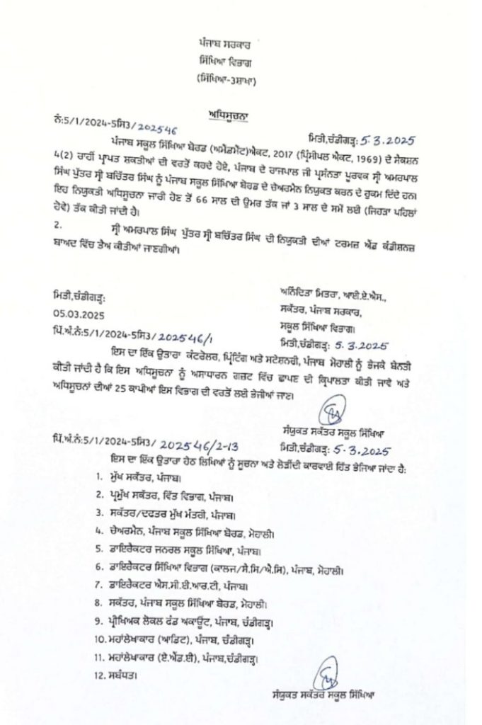 ਪੰਜਾਬ ਦੇ ਮੁੱਖ ਮੰਤਰੀ ਭਗਵੰਤ ਮਾਨ ਦੇ ਹੁਕਮਾਂ ਤੇ ਸਿੱਖਿਆ ਵਿਭਾਗ ਵੱਲੋਂ ਪੰਜਾਬ ਸਕੂਲ ਸਿੱਖਿਆ ਬੋਰਡ ਦੇ ਚੇਅਰਮੈਨ ਦਾ ਅਹੁਦਾ ਜੋ ਕਿ ਕੁਝ ਮਹੀਨਿਆਂ ਤੋਂ ਖਾਲੀ ਪਿਆ ਸੀ ਤੇ ਅਮਰਪਾਲ ਸਿੰਘ ਨੂੰ ਨਵੇਂ ਚੇਅਰਮੈਨ ਵਜੋਂ ਨਿਯੁਕਤ ਕਰਨ ਦੇ ਹੁਕਮ ਜਾਰੀ ਕਰ ਦਿੱਤੇ ਗਏ ਹਨ। ਸਿੱਖਿਆ ਸਕੱਤਰ ਮੈਡਮ ਅਨਦਿੱਤਾ ਮਿੱਤਰਾ ਵੱਲੋਂ ਜਾਰੀ ਕੀਤੇ ਗਏ ਪੱਤਰ ਵਿੱਚ ਚੇਅਰਮੈਨ ਦੇ ਅਹੁਦੇ ਲਈ ਉਹਨਾਂ ਦੀਆਂ ਟਰਮ ਤੇ ਕੰਡੀਸ਼ਨਾਂ ਬਾਅਦ ਵਿੱਚ ਜਾਰੀ ਕਰਨ ਬਾਰੇ ਲਿਖਿਆ ਗਿਆ ਹੈ । ਮਿਲੀ ਜਾਣਕਾਰੀ ਅਨੁਸਾਰ ਅਰਨਪਾਲ ਸਿੰਘ ਸੇਵਾ ਮੁਕਤ ਆਈਏਐਸ ਅਧਿਕਾਰੀ ਹਨ ।