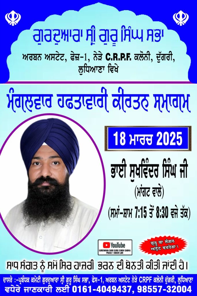 ਲੁਧਿਆਣਾ, 17 ਮਾਰਚ – ਗੁਰਦੁਆਰਾ ਸ੍ਰੀ ਗੁਰੂ ਸਿੰਘ ਸਭਾ ਅਰਬਨ ਅਸਟੇਟ ਫੇਸ-1 ਦੁੱਗਰੀ ਵਿਖੇ ਦੋ ਰੋਜ਼ਾ ਹਫਤਾਵਾਰੀ ਕਥਾ ਅਤੇ ਕੀਰਤਨ ਸਮਾਗਮ ਗੁ: ਸਾਹਿਬ ਦੀ ਪ੍ਰਬੰਧਕ ਕਮੇਟੀ ਅਤੇ ਸੰਗਤਾਂ ਦੇ ਸਹਿਯੋਗ ਨਾਲ ਕਰਵਾਏ ਗਏ, ਜਿਸ ਵਿਚ ਪੰਥ ਪ੍ਰਸਿੱਧ ਕੀਰਤਨੀ ਜਥੇ ਅਤੇ ਪ੍ਰਚਾਰਕਾਂ ਨੇ ਹਾਜ਼ਰੀਆਂ ਭਰੀਆਂ ਅਤੇ ਸੰਗਤਾਂ ਨੂੰ ਨਿਹਾਲ ਕੀਤਾ। ਗੁਰੂ ਘਰ ਦੇ ਮੁੱਖ ਸੇਵਾਦਾਰ ਕੁਲਵਿੰਦਰ ਸਿੰਘ ਬੈਨੀਪਾਲ ਅਤੇ ਪਰਮਿੰਦਰ ਸਿੰਘ ਨੇ ਗੁਰੂ ਘਰ ਦੀ ਬਖਸ਼ਿਸ਼ ਸਿਰੋਪਾਓ ਨਾਲ ਪੰਥ ਪ੍ਰਸਿੱਧ ਰਾਗੀ ਭਾਈ ਮਨਜੀਤ ਸਿੰਘ ਪਠਾਨਕੋਟ ਵਾਲਿਆਂ ਦੇ ਕੀਰਤਨੀ ਜੱਥੇ ਨੂੰ ਸਨਮਾਨਿਤ ਕਰਦਿਆਂ ਆਈਆਂ ਸੰਗਤਾਂ ਦਾ ਧੰਨਵਾਦ ਕੀਤਾ