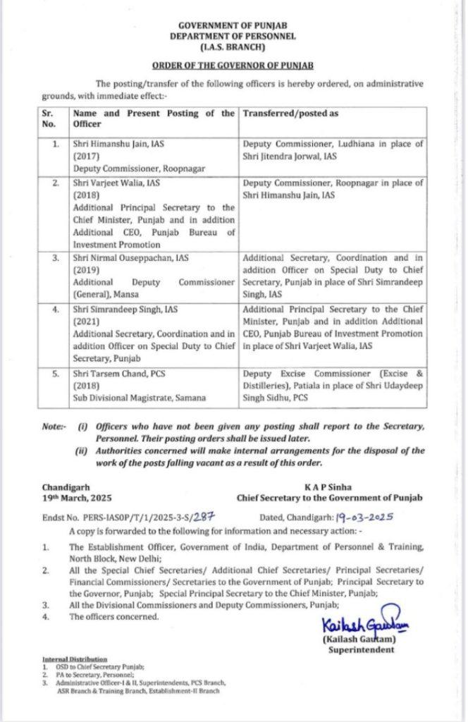 ਪੰਜਾਬ, ਮੁੱਖ ਖ਼ਬਰਾਂ ਪੰਜਾਬ ਸਰਕਾਰ ਨੇ ਲੁਧਿਆਣਾ ਦੇ DC ਸਮੇਤ 4 IAS, 1PCS ਅਧਿਕਾਰੀਆਂ ਦਾ ਕੀਤਾ ਤਬਾਦਲਾ March 19, 2025 Newspunjab Ludhiana:19 march 2025