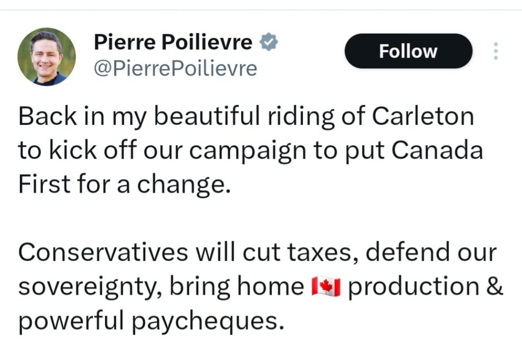 ਵਿਰੋਧੀ ਧਿਰ ਦੇ ਆਗੂ ਪਿਅਰੇ ਪੋਲੀਵਰੇ @ Pierre Poilievre ਨੇ ਕਿਹਾ ਕਿ ਕੰਜ਼ਰਵੇਟਿਵ ਟੈਕਸਾਂ ਵਿੱਚ ਕਟੌਤੀ ਕਰਨਗੇ