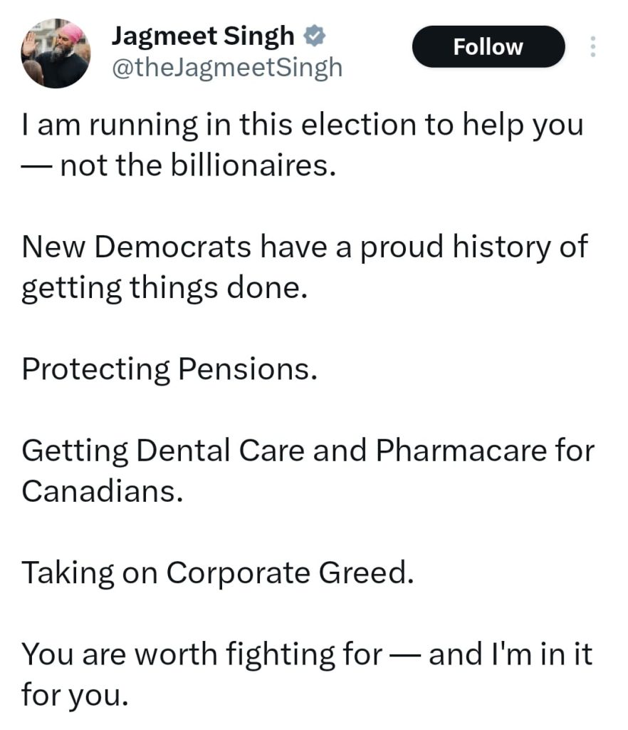 ਸ੍ਰ. ਜਗਮੀਤ ਸਿੰਘ ਨੇ ਕਿਹਾ ਕਿ ਮੈਂ ਇਸ ਚੋਣ ਵਿੱਚ ਅਰਬਪਤੀਆਂ ਦੀ ਨਹੀਂ ਤੁਹਾਡੀ ਮਦਦ ਲਈ ਲੜ ਰਿਹਾ ਹਾਂ।