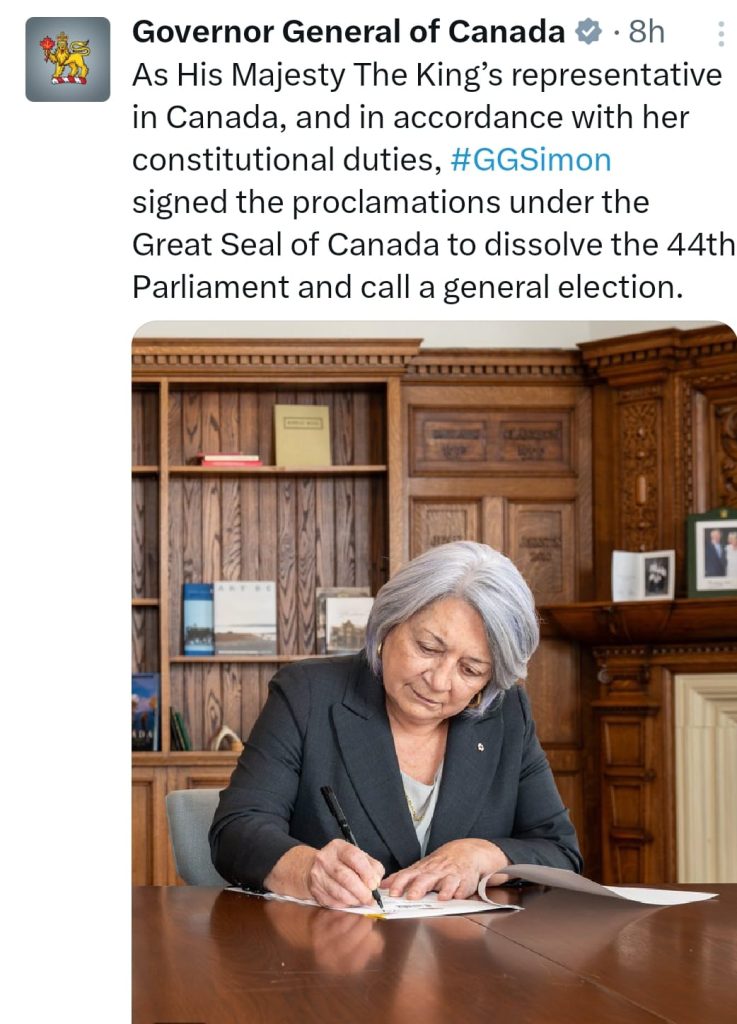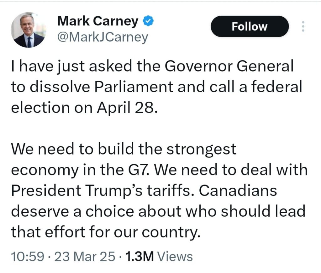 ਕੈਨੇਡਾ ਦੇ ਗਵਰਨਰ ਜਨਰਲ ਮੈਰੀ ਸਾਈਮਨ ਨਾਲ ਕੈਨੇਡਾ ਦੇ ਪ੍ਰਧਾਨ ਮੰਤਰੀ ਮਾਰਕ ਕਾਰਨੇ ਨੇ ਮੁਲਾਕਾਤ ਕਰ ਕੇ ਲੋਕ ਸਭਾ ਭੰਗ ਕਰਨ ਅਤੇ ਫੌਰੀ ਚੋਣਾਂ ਕਰਵਾਉਣ ਦੀ ਬੇਨਤੀ ਕੀਤੀ ਸੀ।ਪ੍ਰਧਾਨ ਮੰਤਰੀ ਮਾਰਕ ਕਾਰਨੇ ਦਾ ਕਹਿਣਾ ਹੈ ਕਿ ਅਮਰੀਕੀ ਰਾਸ਼ਟਰਪਤੀ ਡੋਨਲਡ ਟਰੰਪ ਵੱਲੋਂ ਟੈਰਿਫਾਂ ਬਾਰੇ ਦਿੱਤੀਆਂ ਜਾ ਰਹੀਆਂ ਧਮਕੀਆਂ ਤੋਂ ਨਜਿੱਠਣ ਲਈ ਉਨ੍ਹਾਂ ਨੂੰ ਸਪੱਸ਼ਟ ਬਹੁਮਤ ਦੀ ਲੋੜ ਹੈ।