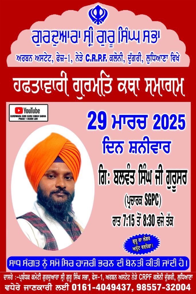 ਲੁਧਿਆਣਾ, 28 ਮਾਰਚ – ਗੁਰਦੁਆਰਾ ਸ੍ਰੀ ਗੁਰੂ ਸਿੰਘ ਸਭਾ ਅਰਬਨ ਅਸਟੇਟ, ਫੇਜ਼-1, ਨੇੜੇ C.R.P.F. ਕਲੋਨੀ, ਦੁੱਗਰੀ, ਲੁਧਿਆਣਾ ਦੇ ਮੁੱਖ ਸੇਵਾਦਾਰ ਸ੍ਰ. ਕੁਲਵਿੰਦਰ ਸਿੰਘ ਬੈਨੀਪਾਲ ਅਨੁਸਾਰ ਗੁਰਦਵਾਰਾ ਸਾਹਿਬ ਵਿਖੇ 29 ਮਾਰਚ 2025 ਦਿਨ ਸ਼ਨੀਵਾਰ ਨੂੰ ਹਫਤਾਵਾਰੀ ਗੁਰਮਤਿ ਕਥਾ ਸਮਾਗਮ ਵਿੱਚ ਪ੍ਰਸਿੱਧ ਕਥਾ ਵਾਚਕ ਗਿ: ਬਲਵੰਤ ਸਿੰਘ ਜੀ ਗੁਰੂਸਰ ਵਾਲੇ ਰਾਤ 7:15 ਤੋਂ 8:30 ਵਜੇ ਤੱਕ ਕਥਾ ਕਰਨਗੇ