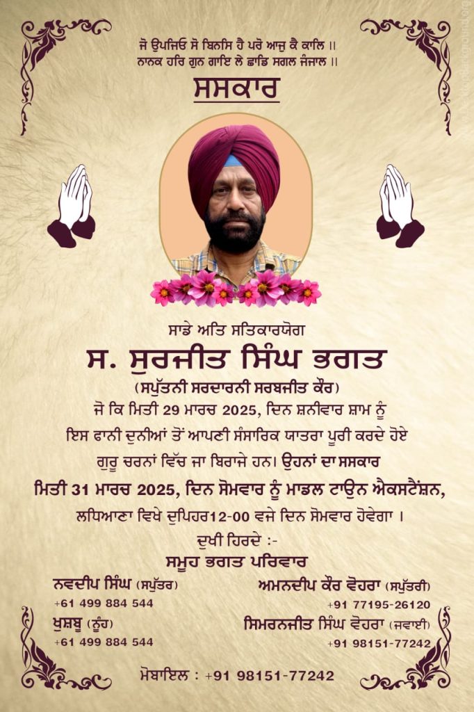 ਲੁਧਿਆਣਾ, 30 ਮਾਰਚ – ਪ੍ਰਸਿੱਧ ਪੱਤਰਕਾਰ ਅਤੇ ਉੱਘੇ ਸਮਾਜ ਸੇਵਕ ਸ੍ਰ. ਸੁਰਜੀਤ ਸਿੰਘ ਭਗਤ ਮਿਤੀ 29 ਮਾਰਚ 2025, ਦਿਨ ਸ਼ਨੀਵਾਰ ਸ਼ਾਮ ਨੂੰ ਇਸ ਫਾਨੀ ਦੁਨੀਆਂ ਤੋਂ ਆਪਣੀ ਸੰਸਾਰਿਕ ਯਾਤਰਾ ਪੂਰੀ ਕਰਦੇ ਹੋਏ ਗੁਰੂ ਚਰਨਾਂ ਵਿੱਚ ਜਾ ਬਿਰਾਜੇ ਹਨ।