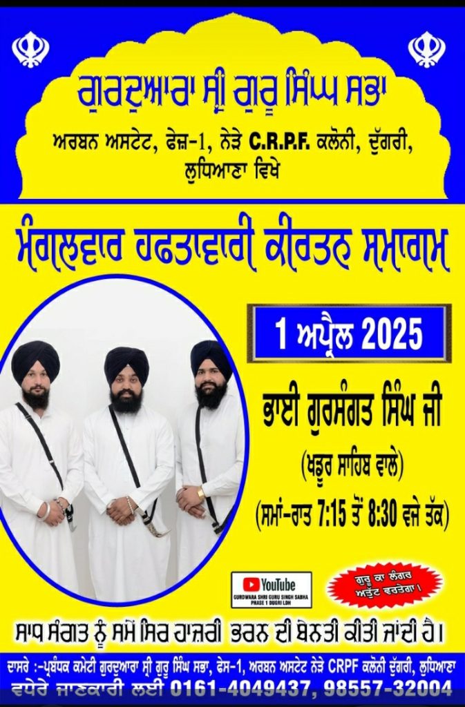 ਲੁਧਿਆਣਾ, 31 ਮਾਰਚ – ਗੁਰਦੁਆਰਾ ਸ੍ਰੀ ਗੁਰੂ ਸਿੰਘ ਸਭਾ ਅਰਬਨ ਅਸਟੇਟ, ਫੇਜ਼-1, ਨੇੜੇ C.R.P.F. ਕਲੋਨੀ, ਦੁੱਗਰੀ, ਲੁਧਿਆਣਾ ਦੇ ਮੁੱਖ ਸੇਵਾਦਾਰ ਸ੍ਰ. ਕੁਲਵਿੰਦਰ ਸਿੰਘ ਬੈਨੀਪਾਲ ਅਨੁਸਾਰ 1 ਅਪ੍ਰੈਲ 2025 ਮੰਗਲਵਾਰ ਹਫਤਾਵਾਰੀ ਕੀਰਤਨ ਸਮਾਗਮ ਵਿੱਚ ਪ੍ਰਸਿੱਧ ਕੀਰਤਨੀ ਜੱਥਾ ਭਾਈ ਗੁਰਸੰਗਤ ਸਿੰਘ ਜੀ (ਖਡੂਰ ਸਾਹਿਬ ਵਾਲੇ) ( ਸਮਾਂ 7:15 ਤੋਂ 8:30 ਵਜੇ ਰਾਤ ਤੱਕ ) ਗੁਰਬਾਣੀ ਦਾ ਮਨੋਹਰ ਕੀਰਤਨ ਕਰਨਗੇ