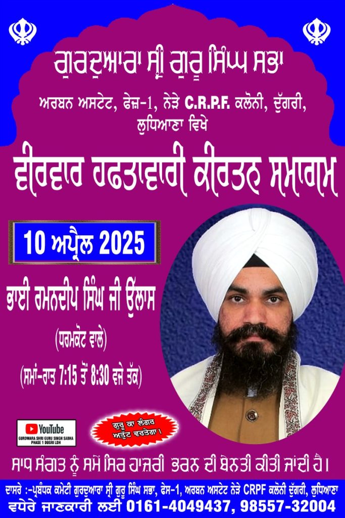 ਲੁਧਿਆਣਾ, 10 ਅਪ੍ਰੈਲ – ਗੁਰਦੁਆਰਾ ਸ੍ਰੀ ਗੁਰੂ ਸਿੰਘ ਸਭਾ ਅਰਬਨ ਅਸਟੇਟ, ਫੇਜ਼-1, ਨੇੜੇ C.R.P.F. ਕਲੋਨੀ, ਦੁੱਗਰੀ, ਲੁਧਿਆਣਾ ਵਿਖੇ ਵੀਰਵਾਰ 10 ਅਪ੍ਰੈਲ 2025 ਨੂੰ ਹਫਤਾਵਾਰੀ ਕੀਰਤਨ ਸਮਾਗਮ ਵਿੱਚ ਭਾਈ ਰਮਨਦੀਪ ਸਿੰਘ ਜੀ ਉੱਲਾਸ (ਧਰਮਕੋਟ ਵਾਲੇ) ਸ਼ਾਮ 7:15 ਵਜੇ ਤੋਂ 8:30 ਵਜੇ ਤੱਕ ਹਾਜ਼ਰੀ ਭਰਨਗੇ, ਗੁਰਦੁਆਰਾ ਸਾਹਿਬ ਦੇ ਮੁੱਖ ਸੇਵਾਦਾਰ ਸ੍ਰ. ਕੁਲਵਿੰਦਰ ਸਿੰਘ ਬੈਨੀਪਾਲ ਨੇ ਸੰਗਤਾਂ ਨੂੰ ਬੇਨਤੀ ਕੀਤੀ ਹੈ ਕਿ ਹੁਮ ਹਮਾ ਕੇ ਪੁੱਜਣ ਅਤੇ ਗੁਰਬਾਣੀ ਦਾ ਅਨੰਦ ਮਾਨਣ, ਉਨ੍ਹਾਂ ਕਿਹਾ ਗੁਰੂ ਕਾ ਲੰਗਰ ਅਤੁੱਟ ਵਰਤੇਗਾ।