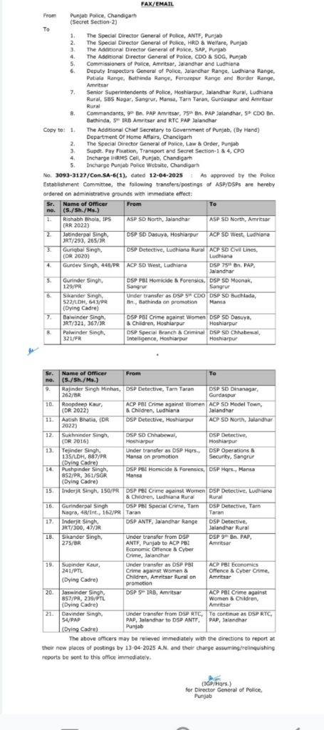 ਪੰਜਾਬ, ਮੁੱਖ ਖ਼ਬਰਾਂ ਪੰਜਾਬ ਸਰਕਾਰ ਵੱਲੋਂ ਪੁਲਿਸ ਵਿੱਚ ਵੱਡਾ ਫੇਰਬਦਲ, 21 DSPs ਦੇ ਕੀਤੇ ਤਬਾਦਲੇ :-ਪੜ੍ਹੋ ਸੂਚੀ April 12, 2025 ਨਿਊਜ਼ ਪੰਜਾਬ 12 ਅਪ੍ਰੈਲ 25