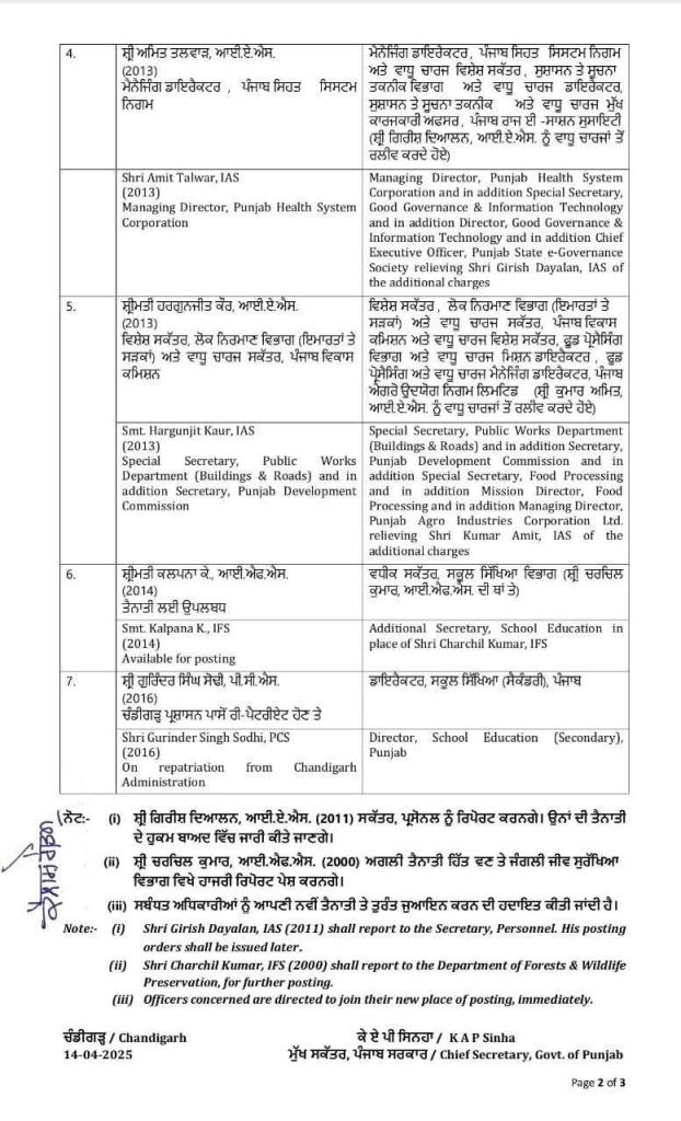 ਪੰਜਾਬ, ਮੁੱਖ ਖ਼ਬਰਾਂ ਪੰਜਾਬ ਸਰਕਾਰ ਵੱਲੋਂ ਪੰਜ ਆਈਏਐਸ , ਇੱਕ ਪੀਸੀਐਸ ਅਤੇ ਇੱਕ ਆਈਐਫਐਸ ਅਧਿਕਾਰੀਆਂ ਦੇ ਤਬਾਦਲੇ April 15, 2025 ਨਿਊਜ਼ ਪੰਜਾਬ 15 ਅਪ੍ਰੈਲ 2025 ਪੰਜਾਬ ਸਰਕਾਰ ਨੇ ਇੱਕ ਪੀਸੀਐਸ ਅਤੇ ਇੱਕ ਆਈਐਫਐਸ ਅਧਿਕਾਰੀ ਅਤੇ ਪੰਜ ਆਈਏਐਸ ਅਧਿਕਾਰੀਆਂ ਦਾ ਤੁਰੰਤ ਪ੍ਰਭਾਵ ਨਾਲ ਤਬਾਦਲਾ ਕਰ ਦਿੱਤਾ।