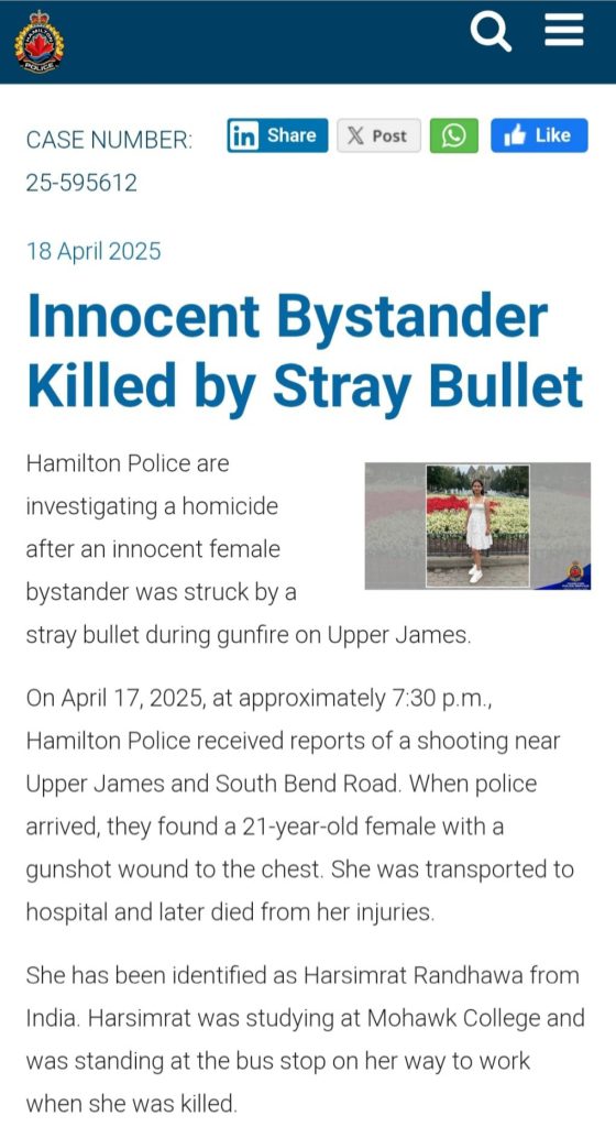 ਮ੍ਰਿਤਕ ਭਾਰਤੀ ਵਿਦਿਆਰਥੀ ਦੀ ਪਛਾਣ ਹਰਸਿਮਰਤ ਰੰਧਾਵਾ ਵਜੋਂ ਹੋਈ ਹੈ, ਜੋ ਕਿ ਕੈਨੇਡਾ ਦੇ ਓਨਟਾਰੀਓ ਦੇ ਹੈਮਿਲਟਨ ਦੇ ਮੋਹੌਕ ਕਾਲਜ ਦੀ ਵਿਦਿਆਰਥਣ ਸੀ। ਟੋਰਾਂਟੋ ਵਿੱਚ ਭਾਰਤ ਦੇ ਕੌਂਸਲੇਟ ਜਨਰਲ ਨੇ ਸੋਸ਼ਲ ਮੀਡੀਆ ‘ਤੇ ਸਾਂਝੀ ਕੀਤੀ ਇੱਕ ਪੋਸਟ ਵਿੱਚ ਲਿਖਿਆ, ‘ਅਸੀਂ ਭਾਰਤੀ ਵਿਦਿਆਰਥਣ ਹਰਸਿਮਰਤ ਰੰਧਾਵਾ ਦੀ ਦੁਖਦਾਈ ਮੌਤ ਤੋਂ ਦੁਖੀ ਹਾਂ।’ ਸਥਾਨਕ ਪੁਲਿਸ ਦੇ ਅਨੁਸਾਰ, ਉਹ ਇੱਕ ਮਾਸੂਮ ਪੀੜਤ ਸੀ ਜੋ ਬੱਸ ਸਟਾਪ ‘ਤੇ ਹੋਈ ਗੋਲੀਬਾਰੀ ਵਿੱਚ ਫਸ ਗਈ ਸੀ। ਪੁਲਿਸ ਘਟਨਾ ਦੀ ਜਾਂਚ ਕਰ ਰਹੀ ਹੈ। ਅਸੀਂ ਪੀੜਤ ਪਰਿਵਾਰ ਦੇ ਸੰਪਰਕ ਵਿੱਚ ਹਾਂ ਅਤੇ ਹਰ ਲੋੜੀਂਦੀ ਮਦਦ ਪ੍ਰਦਾਨ ਕਰ ਰਹੇ ਹਾਂ। ਇਸ ਔਖੇ ਸਮੇਂ ਵਿੱਚ ਸਾਡੀਆਂ ਸੰਵੇਦਨਾਵਾਂ ਪੀੜਤ ਪਰਿਵਾਰ ਦੇ ਨਾਲ ਹਨ।