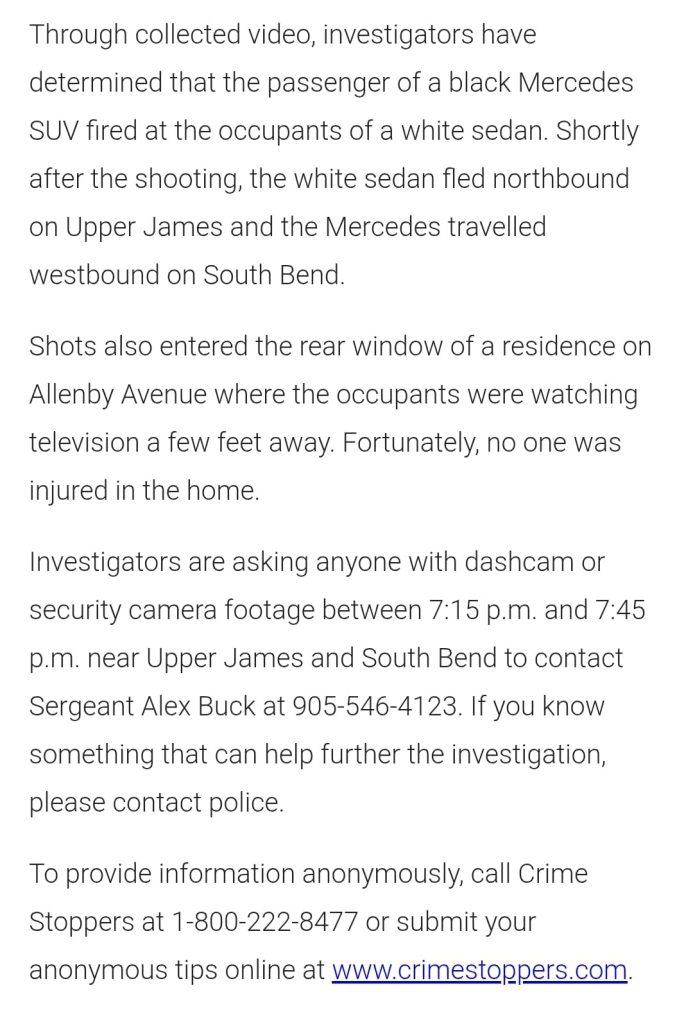 17 ਅਪ੍ਰੈਲ, 2025 ਨੂੰ, ਲਗਭਗ 7:30 ਵਜੇ, ਹੈਮਿਲਟਨ ਪੁਲਿਸ ਨੂੰ ਅੱਪਰ ਜੇਮਸ ਅਤੇ ਸਾਊਥ ਬੈਂਡ ਰੋਡ ਦੇ ਨੇੜੇ ਗੋਲੀਬਾਰੀ ਦੀਆਂ ਰਿਪੋਰਟਾਂ ਮਿਲੀਆਂ। ਜਦੋਂ ਪੁਲਿਸ ਪਹੁੰਚੀ, ਤਾਂ ਉਨ੍ਹਾਂ ਨੂੰ ਇੱਕ 21 ਸਾਲਾ ਲੜਕੀ ਮਿਲੀ ਜਿਸਦੀ ਛਾਤੀ ‘ਤੇ ਗੋਲੀ ਲੱਗੀ ਹੋਈ ਸੀ। ਉਸਨੂੰ ਹਸਪਤਾਲ ਲਿਜਾਇਆ ਗਿਆ ਅਤੇ ਬਾਅਦ ਵਿੱਚ ਉਸਦੀ ਸੱਟਾਂ ਕਾਰਨ ਮੌਤ ਹੋ ਗਈ।