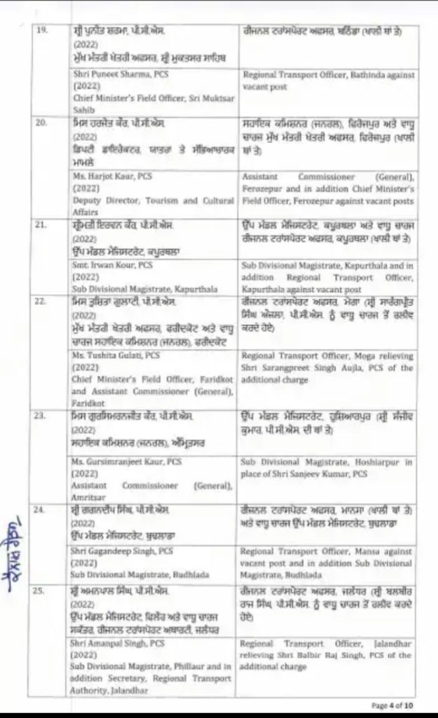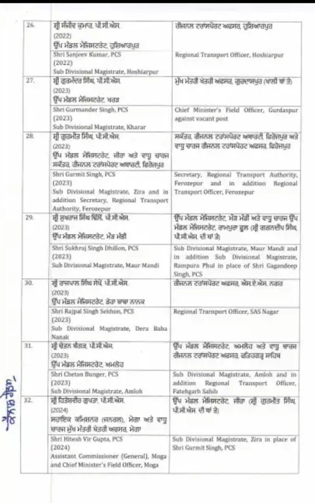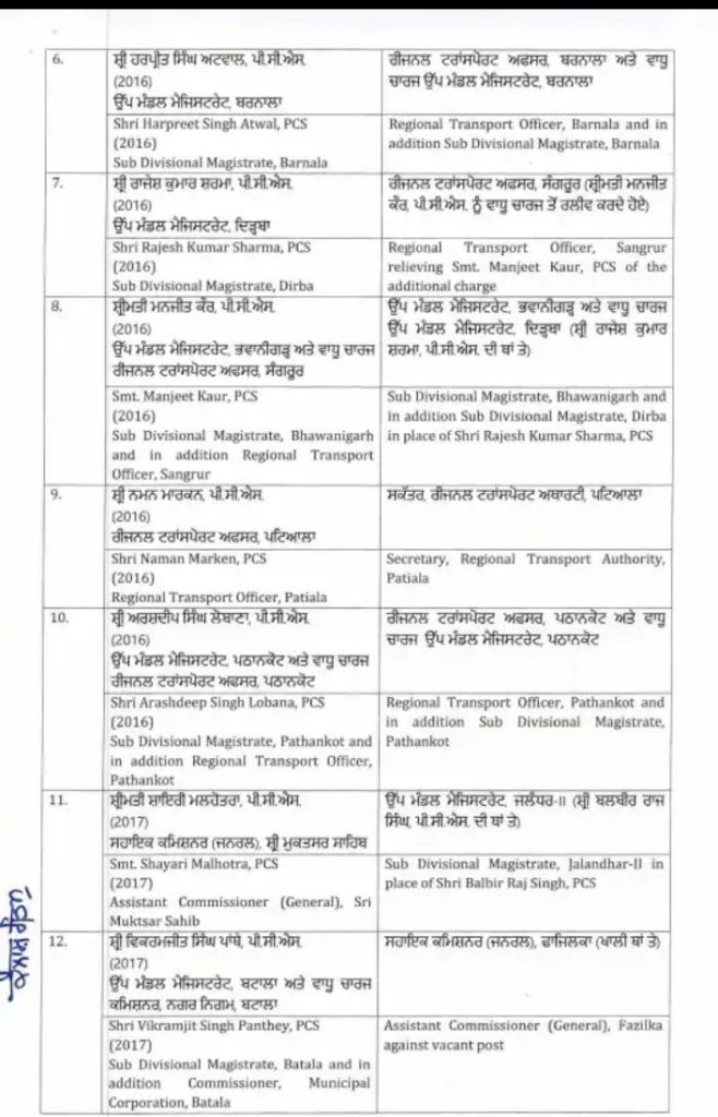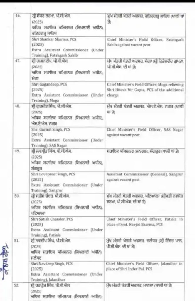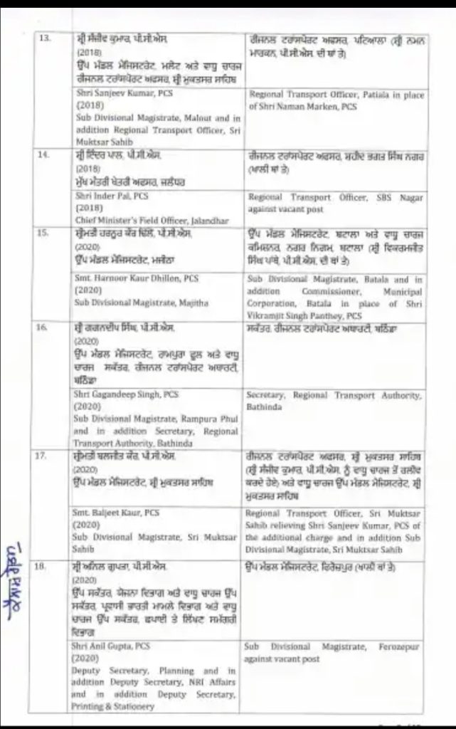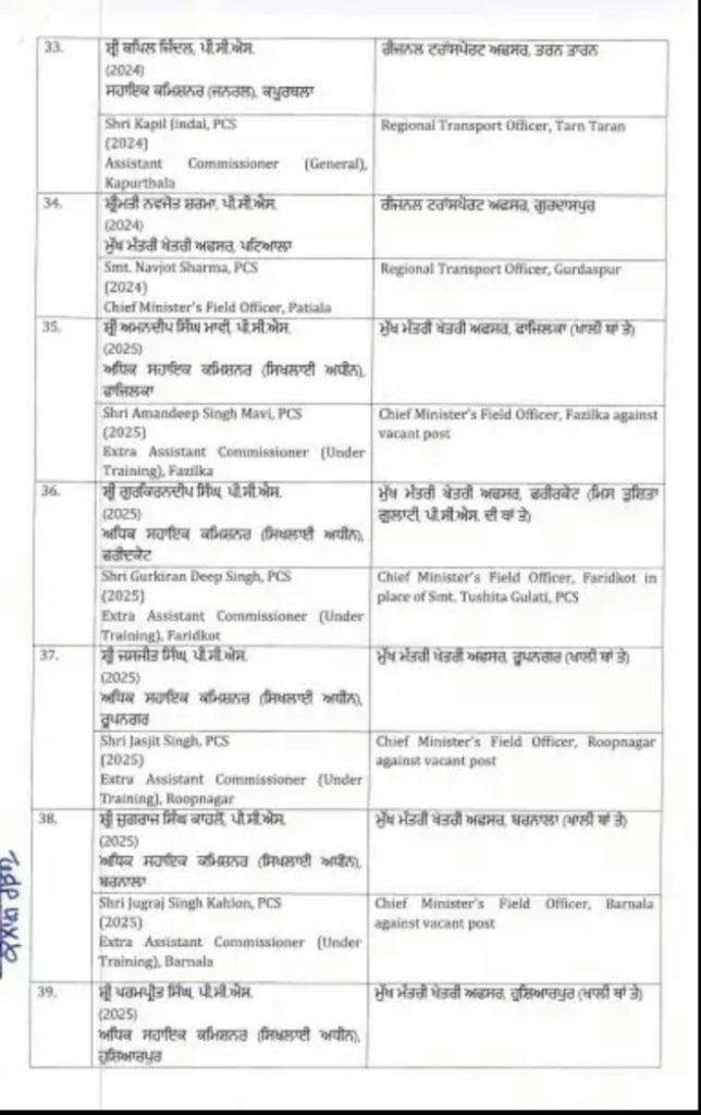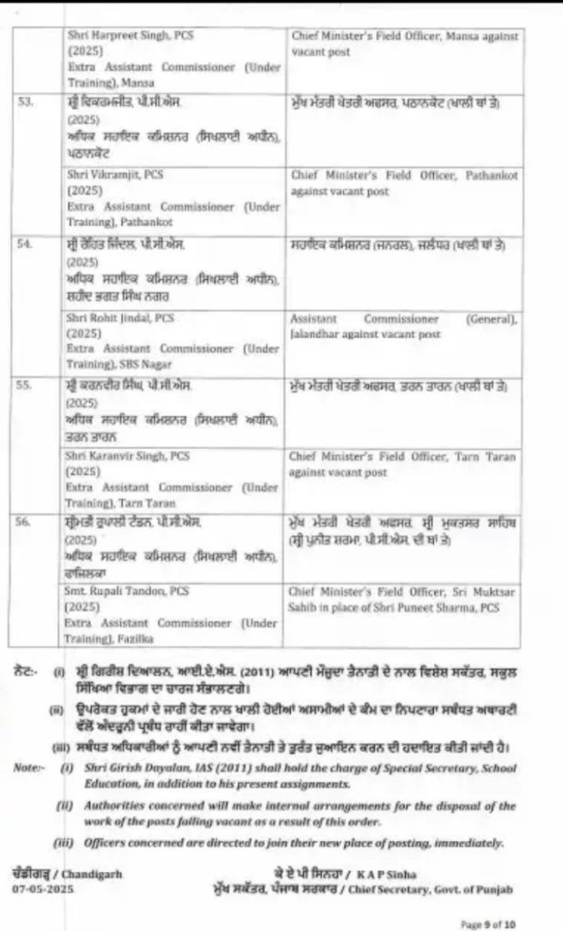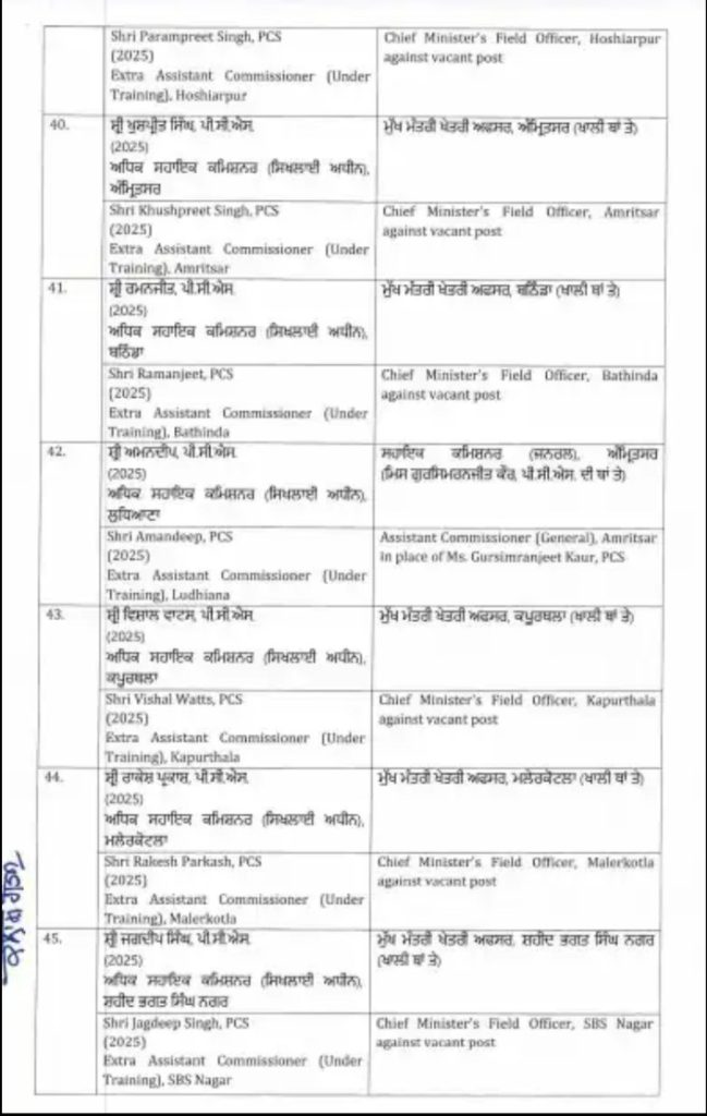 ਪੰਜਾਬ, ਮੁੱਖ ਖ਼ਬਰਾਂ ਪੰਜਾਬ ਵਿੱਚ ਵੱਡਾ ਪ੍ਰਸ਼ਾਸਨਿਕ ਫੇਰਬਦਲ :54 PCS ਅਤੇ 2 IAS ਅਧਿਕਾਰੀਆਂ ਦੇ ਕੀਤੇ ਤਬਾਦਲੇ , ਪੜ੍ਹੋ ਸੂਚੀ May 7, 2025 ਨਿਊਜ਼ ਪੰਜਾਬ 7 ਮਈ 2025 ਪੰਜਾਬ ਵਿੱਚ ਵੱਡਾ ਪ੍ਰਸ਼ਾਸਨਿਕ ਫੇਰਬਦਲ ਕੀਤਾ ਗਿਆ,54 PCS ਅਤੇ 2 IAS ਅਧਿਕਾਰੀਆਂ ਦੇ ਤਬਾਦਲੇ ਕੀਤੇ ਗਏ।ਜਿਨ੍ਹਾਂ ਅਧਿਕਾਰੀਆਂ ਦੇ ਤਬਾਲਦੇ ਕੀਤੇ ਗਏ ਹਨ ਉਨ੍ਹਾਂ ਦੀ ਲਿਸਟ ਹੇਠ ਅਨੁਸਾਰ ਦੇਖ ਸਕਦੇ ਹੋ:-