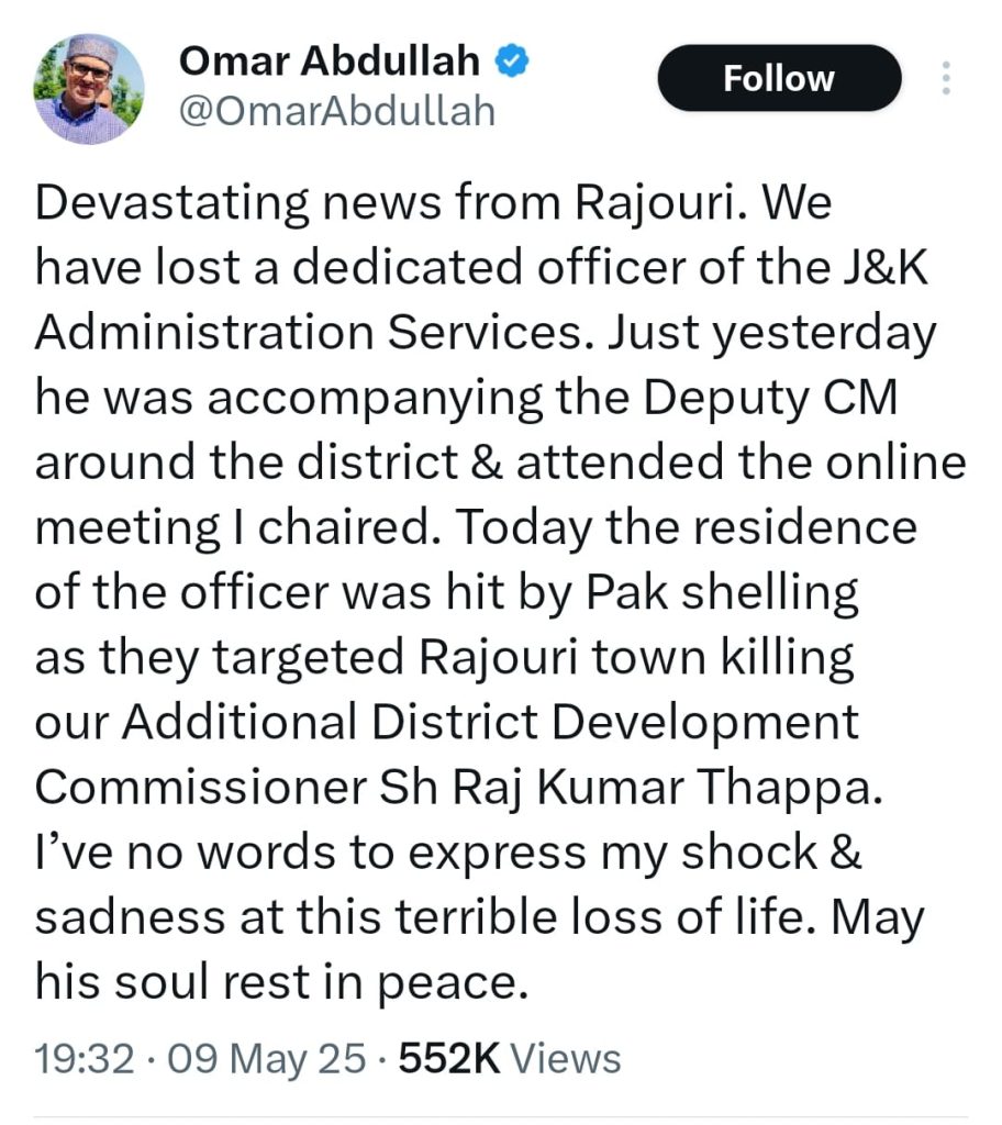 “ਰਾਜੌਰੀ ਤੋਂ ਦੁਖਦਾਈ ਖਬਰ। ਅਸੀਂ ਜੰਮੂ-ਕਸ਼ਮੀਰ ਪ੍ਰਸ਼ਾਸਨ ਸੇਵਾਵਾਂ ਦੇ ਇੱਕ ਸਮਰਪਿਤ ਅਧਿਕਾਰੀ ਨੂੰ ਗੁਆ ਦਿੱਤਾ ਹੈ। ਕੱਲ੍ਹ ਹੀ ਉਹ ਉਪ ਮੁੱਖ ਮੰਤਰੀ ਦੇ ਨਾਲ ਜ਼ਿਲ੍ਹੇ ਭਰ ਵਿੱਚ ਘੁੰਮ ਰਿਹਾ ਸੀ ਅਤੇ ਮੇਰੀ ਪ੍ਰਧਾਨਗੀ ਵਾਲੀ ਆਨਲਾਈਨ ਮੀਟਿੰਗ ਵਿੱਚ ਸ਼ਾਮਲ ਹੋਇਆ। ਅੱਜ ਅਧਿਕਾਰੀ ਦੀ ਰਿਹਾਇਸ਼ ਨੂੰ ਪਾਕਿ ਗੋਲਾਬਾਰੀ ਨਾਲ ਪ੍ਰਭਾਵਿਤ ਕੀਤਾ ਗਿਆ ਕਿਉਂਕਿ ਉਨ੍ਹਾਂ ਨੇ ਰਾਜੌਰੀ ਕਸਬੇ ਨੂੰ ਨਿਸ਼ਾਨਾ ਬਣਾ ਕੇ ਸਾਡੇ ਵਧੀਕ ਜ਼ਿਲ੍ਹਾ ਵਿਕਾਸ ਕਮਿਸ਼ਨਰ ਸ਼੍ਰੀ ਰਾਜ ਕੁਮਾਰ ਥੱਪਾ ਦੀ ਹੱਤਿਆ ਕਰ ਦਿੱਤੀ। ਮੇਰੇ ਕੋਲ ਇਸ ਭਿਆਨਕ ਜਾਨੀ ਨੁਕਸਾਨ ‘ਤੇ ਆਪਣੇ ਸਦਮੇ ਅਤੇ ਉਦਾਸੀ ਨੂੰ ਪ੍ਰਗਟ ਕਰਨ ਲਈ ਕੋਈ ਸ਼ਬਦ ਨਹੀਂ ਹਨ। ਉਸਦੀ ਆਤਮਾ ਨੂੰ ਸ਼ਾਂਤੀ ਮਿਲੇ।”