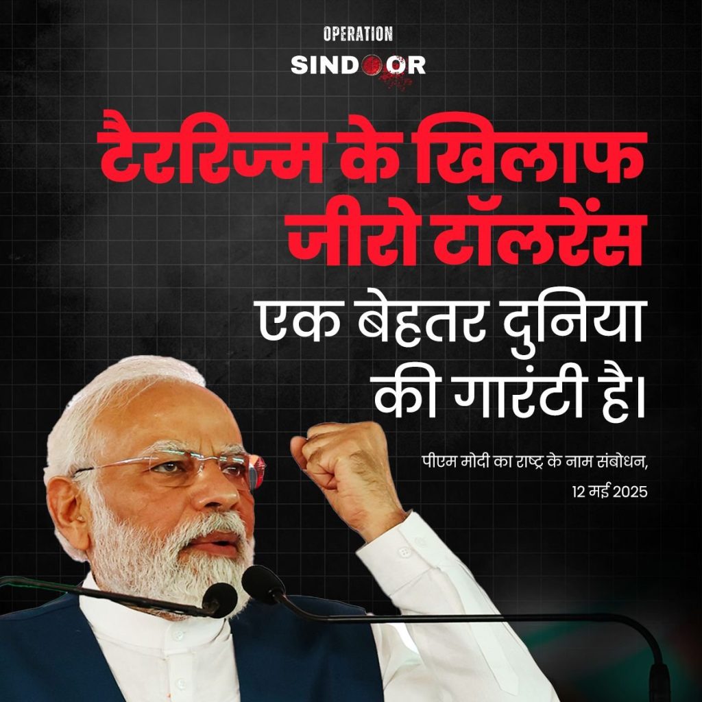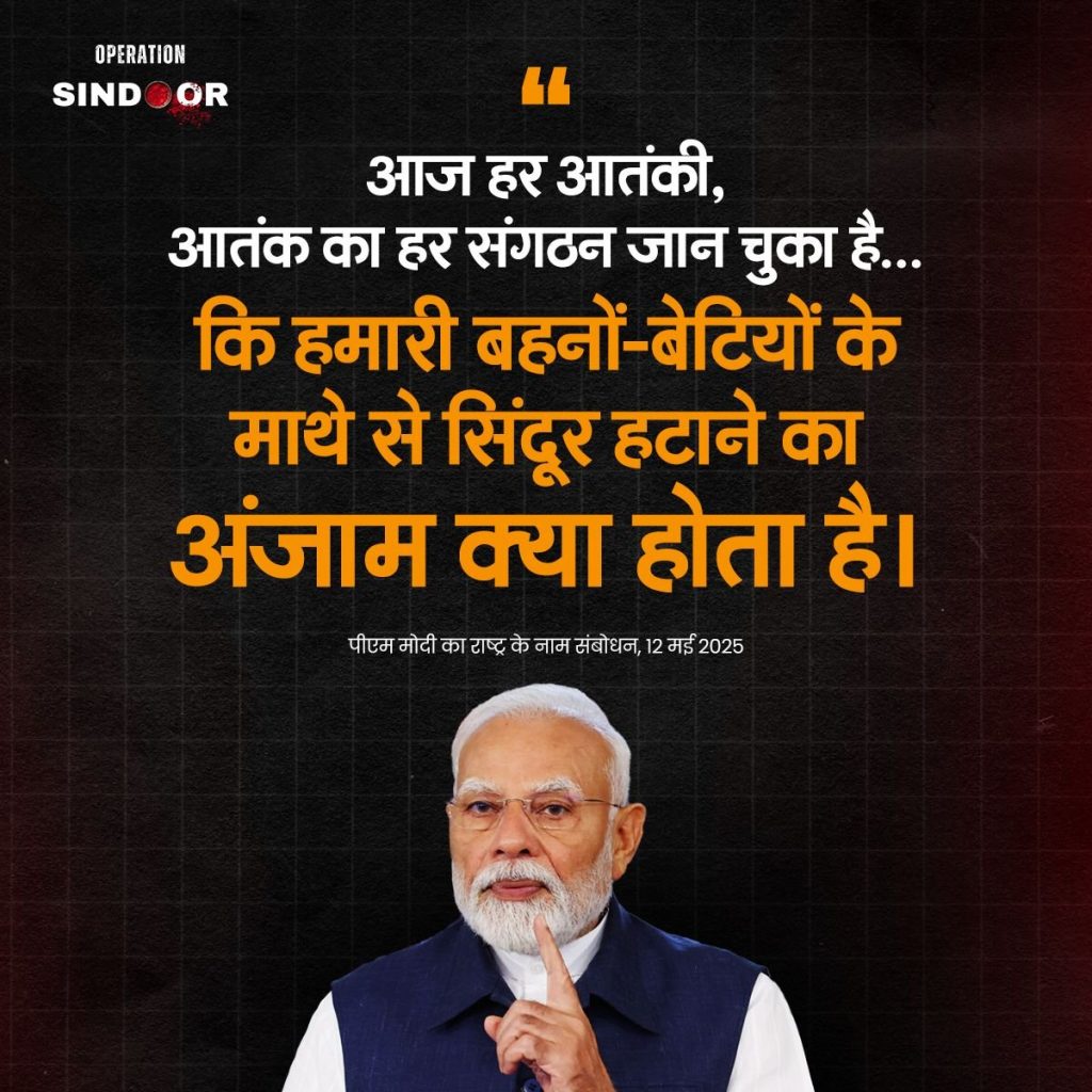 ਪ੍ਰਧਾਨ ਮੰਤਰੀ ਨੇ ਕਿਹਾ, ਇਸ ਅੱਤਵਾਦੀ ਹਮਲੇ ਤੋਂ ਬਾਅਦ, ਪੂਰਾ ਦੇਸ਼, ਹਰ ਨਾਗਰਿਕ, ਹਰ ਵਰਗ, ਹਰ ਸਮਾਜ, ਹਰ ਰਾਜਨੀਤਿਕ ਪਾਰਟੀ ਅੱਤਵਾਦ ਵਿਰੁੱਧ ਸਖ਼ਤ ਕਾਰਵਾਈ ਲਈ ਇੱਕ ਆਵਾਜ਼ ਵਿੱਚ ਖੜ੍ਹਾ ਹੋਇਆ। ਅਸੀਂ ਭਾਰਤੀ ਫੌਜ ਨੂੰ ਅੱਤਵਾਦੀਆਂ ਦਾ ਸਫਾਇਆ ਕਰਨ ਲਈ ਖੁੱਲ੍ਹੀ ਛੁੱਟੀ ਦਿੱਤੀ ਹੈ ਅਤੇ ਅੱਜ ਹਰ ਅੱਤਵਾਦੀ, ਹਰ ਅੱਤਵਾਦੀ ਸੰਗਠਨ ਜਾਣਦਾ ਹੈ ਕਿ ਸਾਡੀਆਂ ਭੈਣਾਂ ਅਤੇ ਧੀਆਂ ਦੇ ਮੱਥੇ ਤੋਂ ਸਿੰਦੂਰ ਲਾਹੁਣ ਦੇ ਕੀ ਨਤੀਜੇ ਨਿਕਲ ਸਕਦੇ ਹਨ। ਉਨ੍ਹਾਂ ਅੱਗੇ ਕਿਹਾ, ਆਪ੍ਰੇਸ਼ਨ ਸਿੰਦੂਰ ਸਿਰਫ਼ ਇੱਕ ਨਾਮ ਨਹੀਂ ਹੈ। ਇਹ ਦੇਸ਼ ਦੇ ਕਰੋੜਾਂ ਲੋਕਾਂ ਦੀਆਂ ਭਾਵਨਾਵਾਂ ਦਾ ਪ੍ਰਤੀਬਿੰਬ ਹੈ। ਆਪ੍ਰੇਸ਼ਨ ਸਿੰਦੂਰ ਨਿਆਂ ਦੀ ਇੱਕ ਅਟੁੱਟ ਸਹੁੰ ਹੈ। 6 ਮਈ ਦੀ ਦੂਰ ਰਾਤ ਨੂੰ, 7 ਮਈ ਦੀ ਸਵੇਰ ਨੂੰ ਪੂਰੀ ਦੁਨੀਆ ਨੇ ਇਸ ਵਾਅਦੇ ਨੂੰ ਨਤੀਜੇ ਵਿੱਚ ਬਦਲਦੇ ਦੇਖਿਆ।