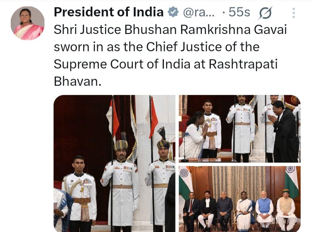 ਸੁਪਰੀਮ ਕੋਰਟ ਦੇ ਮੁੱਖ ਜੱਜ (CJI) ਬਣੇ ਜਸਟਿਸ ਭੂਸ਼ਣ ਰਾਮਕ੍ਰਿਸ਼ਨ ਗਵਈ – ਰਾਸ਼ਟਰਪਤੀ ਦ੍ਰੋਪਦੀ ਮੁਰਮੂ ਨੇ ਸਹੁੰ ਚੁਕਾਈ