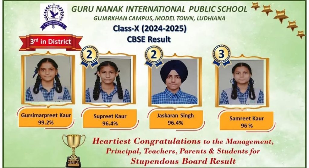 ਗੁਰੂ ਨਾਨਕ ਇੰਟਰਨੈਸ਼ਨਲ ਪਬਲਿਕ ਸਕੂਲ ਮਾਡਲ ਟਾਊਨ ਲੁਧਿਆਣਾ ਦੀ ਪ੍ਰਬੰਧਕ ਕਮੇਟੀ ਅਤੇ ਪ੍ਰਿੰਸੀਪਲ ਸ੍ਰੀਮਤੀ ਗੁਰਮੰਤ ਕੌਰ ਨੇ ਵਧੇਰੇ ਅੰਕ ਪ੍ਰਾਪਤ ਕਰਨ ਵਾਲੇ ਸਾਰੇ ਵਿਦਿਆਰਥੀਆਂ ਨੂੰ ਵਧਾਈ ਦਿੰਦੇ ਹੋਏ ਸਕੂਲ ਦੇ ਹੋਰਨਾਂ ਵਿਦਿਆਰਥੀਆਂ ਨੂੰ ਵੀ ਇਸੇ ਤਰ੍ਹਾਂ ਸਖ਼ਤ ਮਿਹਨਤ ਕਰਕੇ ਸਕੂਲ ਦਾ ਨਾਮ ਰੋਸ਼ਨ ਕਰਨ ਲਈ ਪ੍ਰੇਰਿਤ ਕੀਤਾ।
