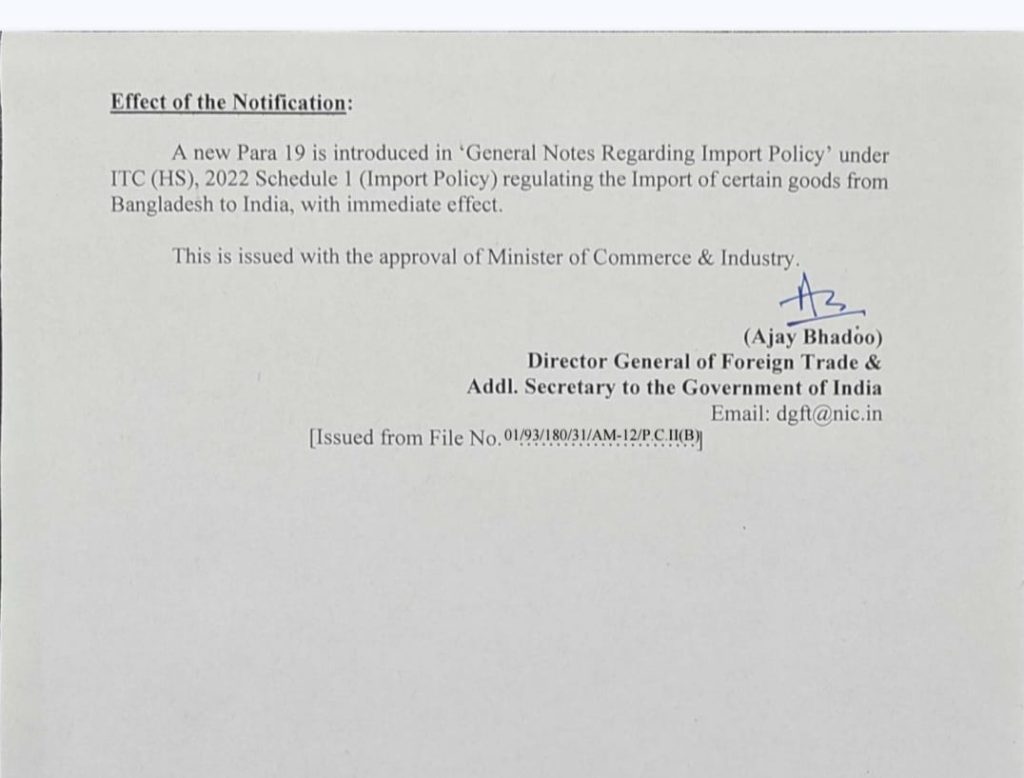 ਭਾਰਤ ਨੇ ਬੰਗਲਾਦੇਸ਼ ‘ਤੇ ਕਈ ਬੰਦਰਗਾਹ ਵਪਾਰਕ ਪਾਬੰਦੀਆਂ ਲਾਈਆਂ – ਨਹੀਂ ਹੋ ਸਕਦਾ ਇਹਨਾਂ ਵਸਤੂਆਂ ਦਾ ਵਪਾਰ – ਪੜ੍ਹੋ ਜਾਰੀ ਨੋਟੀਫਿਕੇਸ਼ਨ Port restriction on import of certain goods from Bangladesh to India