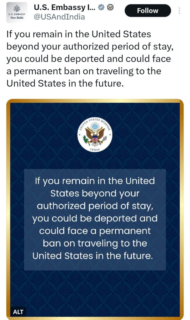 “ਜੇਕਰ ਤੁਸੀਂ ਆਪਣੀ ਅਧਿਕਾਰਤ ਠਹਿਰਾਅ ਦੀ ਮਿਆਦ ਤੋਂ ਵੱਧ ਸਮੇਂ ਲਈ ਸੰਯੁਕਤ ਰਾਜ ਅਮਰੀਕਾ ਵਿੱਚ ਰਹਿੰਦੇ ਹੋ, ਤਾਂ ਤੁਹਾਨੂੰ ਦੇਸ਼ ਨਿਕਾਲਾ ਦਿੱਤਾ ਜਾ ਸਕਦਾ ਹੈ ਅਤੇ ਭਵਿੱਖ ਵਿੱਚ ਸੰਯੁਕਤ ਰਾਜ ਅਮਰੀਕਾ ਦੀ ਯਾਤਰਾ ਕਰਨ ‘ਤੇ ਸਥਾਈ ਪਾਬੰਦੀ ਦਾ ਸਾਹਮਣਾ ਕਰਨਾ ਪੈ ਸਕਦਾ ਹੈ,” ਪੋਸਟ ਵਿੱਚ ਲਿਖਿਆ ਹੈ।