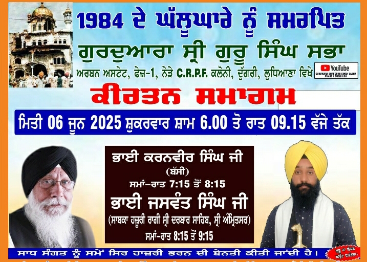 ਪੰਥ ਦੇ ਪ੍ਰਸਿੱਧ ਕੀਰਤਨੀਏ ਭਾਈ ਜਸਵੰਤ ਸਿੰਘ ਜੀ ਸਾਬਕਾ ਹਜ਼ੂਰੀ ਰਾਗੀ ਸੱਚਖੰਡ ਸ਼੍ਰੀ ਦਰਬਾਰ ਸਾਹਿਬ ਅੰਮ੍ਰਿਤਸਰ, ਭਾਈ ਪਰਮਵੀਰ ਸਿੰਘ ,ਭਾਈ ਸਤਿੰਦਰਪਾਲ ਸਿੰਘ(ਅਖੰਡ ਕੀਰਤਨੀ ਜੱਥਾ)ਲੁਧਿਆਣੇ ਵਾਲਿਆਂ, ਦੇ ਕੀਰਤਨੀ ਜੱਥਿਆਂ ਸਮੇਤ ਇਸਤਰੀ ਸਤਿਸੰਗ ਸਭਾ ਦੀਆਂ ਬੀਬੀਆਂ ਦੇ ਕੀਰਤਨੀ ਜੱਥੇ ਨੇ ਵਿਸ਼ੇਸ਼ ਤੌਰ ਤੇ ਆਪਣੀਆਂ ਹਾਜ਼ਰੀਆਂ ਭਰ ਕੇ ਸੰਗਤਾਂ ਨੂੰ ਗੁਰਬਾਣੀ ਕੀਰਤਨ ਰਾਹੀਂ ਨਿਹਾਲ ਕੀਤਾ ‘।ਸਮਾਗਮ ਦੌਰਾਨ ਗੁਰਦੁਆਰਾ ਸਾਹਿਬ ਦੇ ਪ੍ਰਧਾਨ ਸ.ਗੁਰਮੀਤ ਸਿੰਘ ਸਲੂਜਾ ਨੇ ਇੱਕਤਰ ਹੋਈਆਂ ਸੰਗਤਾਂ ਨੂੰ ਸੰਬੋਧਨ ਕਰਦਿਆਂ ਹੋਇਆ ਕਿਹਾ ਕਿ ਅੱਜ ਲੋੜ ਹੈ,ਅਸੀਂ ਸ਼੍ਰੀ ਗੁਰੁ ਅਰਜਨ ਦੇਵ ਜੀ ਦੇ ਸ਼ਹੀਦੀ ਪੁਰਬ ਤੇ ਉਨ੍ਹਾਂ ਦੀ ਮਹਾਨ ਕੁਰਬਾਨੀ ਤੇ ਸ਼ਹੀਦੀ ਫ਼ਲਸਫ਼ੇ ਨੂੰ ਹਿਰਦਿਆਂ ਵਿਚ ਵਸਾ ਕੇ ਲੋਕਾਈ ਦੀ ਸੇਵਾ ਵਿੱਚ ਜੁਟ ਜਾਈਏ। ਉਨ੍ਹਾਂ ਨੇ ਗੁਰਦੁਆਰਾ ਸਾਹਿਬ ਵਿਖੇ ਆਯੋਜਿਤ ਕੀਤੇ ਗਏ ਕੀਰਤਨ ਸਮਾਗਮ ਨੂੰ ਇੱਕ ਉਪਦੇਸ਼ਕ ਸਮਾਗਮ ਦੱਸਦਿਆਂ ਸਮਾਗਮ ਅੰਦਰ ਜੁੜ ਬੈਠੀਆਂ ਸੰਗਤਾਂ ਨੂੰ ਧਰਮ ਦੇ ਮਾਰਗ ਉਪਰ ਚੱਲਣ ,ਬਾਣੀ ਤੇ ਬਾਣੇ ਦੇ ਧਾਰਨੀ ਬਣਨ ਦੀ ਤਾਕੀਦ ਵੀ ਕੀਤੀ।ਇਸ ਦੌਰਾਨ ਉਨ੍ਹਾਂ ਦੇ ਨਾਲ ਗੁਰਦੁਆਰਾ ਸਾਹਿਬ ਦੇ ਚੇਅਰਮੈਨ ਬਲਦੇਵ ਸਿੰਘ, ਗੁਰਚਰਨ ਸਿੰਘ ਚੰਨ ਸੀਨੀਅਰ ਮੀਤ ਪ੍ਰਧਾਨ, ਅਮਰਜੀਤ ਸਿੰਘ ਟੋਨੀ ਮੱਕੜ,ਕੁਲਵਿੰਦਰ ਸਿੰਘ ਲਾਡੀ ਦਿਲਜੰਗ ਸਿੰਘ, ਅਮਰਜੀਤ ਸਿੰਘ ਪਰੂਥੀ, ਜਗਤਾਰ ਸਿੰਘ ਸੋਨੀ, ਮਹਿੰਦਰਪਾਲ ਸਿੰਘ ਗਲਹੋਤਰਾ,ਕੁਲਦੀਪ ਸਿੰਘ ਦੀਪਾ, ਭੁਪਿੰਦਰ ਸਿੰਘ ਸਲੂਜਾ, ਰਜਿੰਦਰ ਸਿੰਘ ਸਲੂਜਾ, ਸੁਰਿੰਦਰਪਾਲ ਸਿੰਘ ਜਸਬੀਰ ਸਿੰਘ ਜੇ ਸਨਜ਼, ਹਰਕ੍ਰਿਸ਼ਨ ਸਿੰਘ ਮਕੱੜ,ਹਰਮਨਦੀਪ ਸਿੰਘ, ਭੁਪਿੰਦਰ ਸਿੰਘ ਛਾਬੜਾ, ਕਵੰਲਜੀਤ ਸਿੰਘ ਛਾਬੜਾ ਵਿਸ਼ੇਸ਼ ਤੌਰ ਤੇ ਹਾਜਰ ਸਨ।