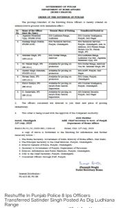 ਪੰਜਾਬ ਸਰਕਾਰ ਨੇ ਅੱਜ ਪੁਲਿਸ ਵਿਭਾਗ ਵਿੱਚ ਵੱਡਾ ਫੇਰਬਦਲ ਕਰਦਿਆ 8 ਆਈਪੀਐਸ ਅਧਿਕਾਰੀਆਂ ਦੇ ਤਬਾਦਲੇ ਕਰ ਦਿੱਤੇ ਹਨ।ਇਸ ਸਬੰਧੀ ਜਾਰੀ ਹੁਕਮਾਂ ਮੁਤਾਬਿਕ ਜਗਦਲੇ ਨਿਲਾਂਬਰੀ ਵਿਜੈ ਆਈਪੀਐੱਸ ਨੂੰ ਡੀਆਈਜੀ ਕਾਊਂਟਰ ਇੰਟੈਲੀਜੈਂਸ ਪੰਜਾਬ, ਐੱਸਏਐੱਸ ਨਗਰ ਤੇ ਕੁਲਦੀਪ ਸਿੰਘ ਚਾਹਲ ਆਈਪੀਐੱਸ ਨੂੰ ਡੀਆਈਜੀ ਤਕਨੀਕੀ ਸਰਵਿਸ, ਪੰਜਾਬ, ਚੰਡੀਗੜ੍ਹ ਅਤੇ ਡੀਆਈਜੀ ਪਟਿਆਲਾ ਰੇਂਜ ਦਾ ਵਾਧੂ ਚਾਰ ਸੌਂਪਿਆ ਹੈ।