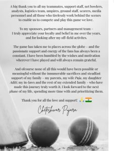 ਭਾਰਤੀ ਕ੍ਰਿਕਟਰ ਚੇਤੇਸ਼ਵਰ ਪੁਜਾਰਾ ਨੇ ਅੰਤਰਰਾਸ਼ਟਰੀ ਕ੍ਰਿਕਟ ਤੋਂ ਸੰਨਿਆਸ ਲੈ ਲਿਆ ਹੈ। ਉਨ੍ਹਾਂ ਨੇ ਐਤਵਾਰ ਨੂੰ ਸੋਸ਼ਲ ਮੀਡੀਆ ‘ਤੇ ਇੱਕ ਭਾਵੁਕ ਪੋਸਟ ਪਾ ਕੇ ਆਪਣੇ ਸੰਨਿਆਸ ਦੀ ਜਾਣਕਾਰੀ ਦਿੱਤੀ। ਪੁਜਾਰਾ ਨੇ ਆਪਣਾ ਆਖਰੀ ਅੰਤਰਰਾਸ਼ਟਰੀ ਮੈਚ ਜੂਨ 2023 ਵਿੱਚ ਖੇਡਿਆ ਸੀ। ਉਨ੍ਹਾਂ ਦਾ ਅੰਤਰਰਾਸ਼ਟਰੀ ਕਰੀਅਰ 15 ਸਾਲ ਚੱਲਿਆ। ਪੁਜਾਰਾ ਨੇ ਸਾਲ 2010 ਵਿੱਚ ਅੰਤਰਰਾਸ਼ਟਰੀ ਕ੍ਰਿਕਟ ਵਿੱਚ ਆਪਣਾ ਡੈਬਿਊ ਕੀਤਾ ਸੀ। ਉਸਨੇ ਬੰਗਲੌਰ ਵਿੱਚ ਆਸਟ੍ਰੇਲੀਆ ਵਿਰੁੱਧ ਆਪਣਾ ਡੈਬਿਊ ਕੀਤਾ ਸੀ, ਜੋ ਕਿ ਇੱਕ ਟੈਸਟ ਮੈਚ ਸੀ।