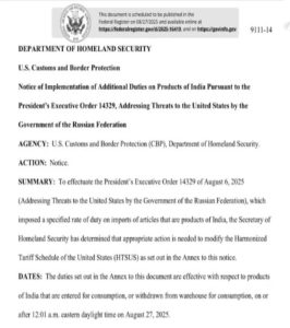 ਟਰੰਪ ਪ੍ਰਸ਼ਾਸਨ ਦਾ ਕਹਿਣਾ ਹੈ ਕਿ ਭਾਰਤ ਵੱਲੋਂ ਰੂਸ ਤੋਂ ਤੇਲ ਦੀ ਲਗਾਤਾਰ ਖਰੀਦ ਅਮਰੀਕਾ ਦੀ ਰਾਸ਼ਟਰੀ ਸੁਰੱਖਿਆ ਲਈ ਚਿੰਤਾ ਦੀ ਗੱਲ ਹੈ। ਯੂਐਸ ਡਿਪਾਰਟਮੈਂਟ ਆਫ ਹੋਮਲੈਂਡ ਸਿਕਿਊਰਿਟੀ ਨੇ ਕਸਟਮਜ਼ ਐਂਡ ਬੌਰਡਰ ਪ੍ਰੋਟੈਕਸ਼ਨ ਰਾਹੀਂ ਟੈਰਿਫ ਨੂੰ ਲੈ ਕੇ ਜਾਣਕਾਰੀ ਸਾਂਝੀ ਕੀਤੀ ਹੈ। ਟਰੰਪ ਇਸ ਰਾਹੀਂ ਭਾਰਤ ‘ਤੇ ਦਬਾਅ ਵਧਾਉਣਾ ਚਾਹੁੰਦੇ ਹਨ। ਉਹ ਪਹਿਲਾਂ ਭਾਰਤ ‘ਤੇ 25 ਪ੍ਰਤੀਸ਼ਤ ਟੈਰਿਫ ਲਗਾ ਚੁੱਕੇ ਸਨ, ਪਰ ਹੁਣ ਇਸਨੂੰ ਵਧਾ ਕੇ 50 ਪ੍ਰਤੀਸ਼ਤ ਕਰ ਦਿੱਤਾ ਹੈ।