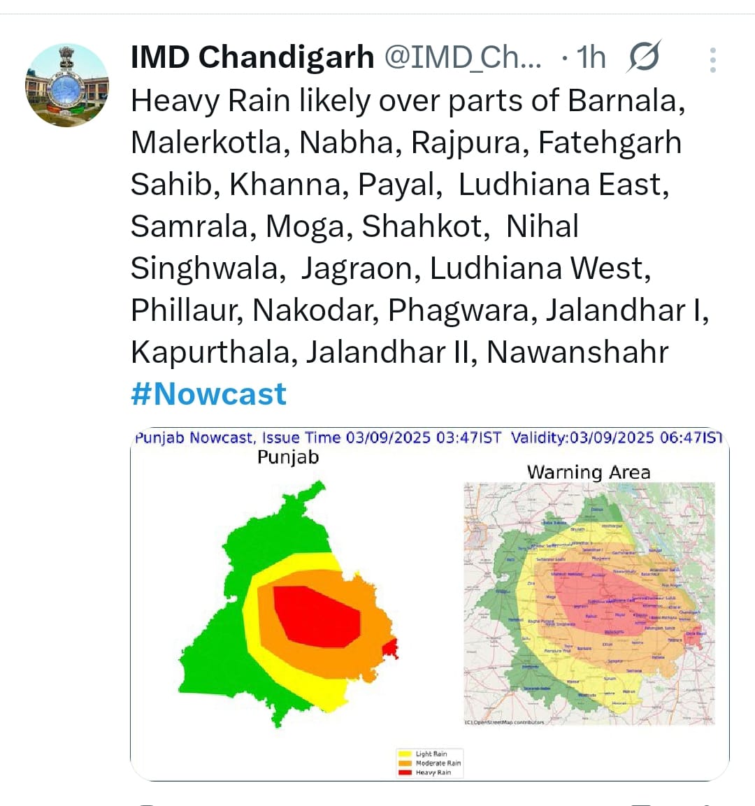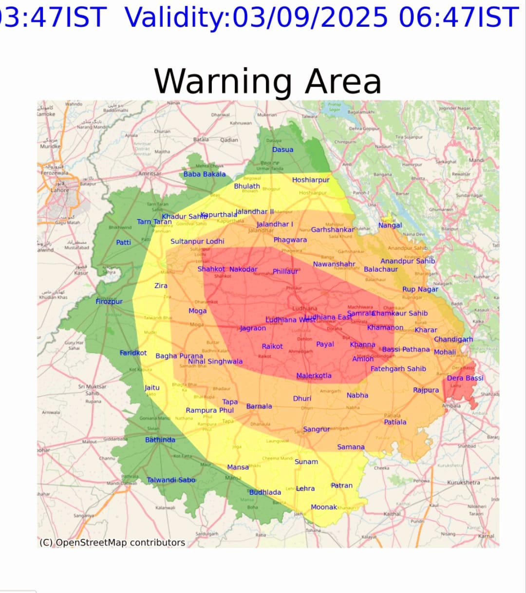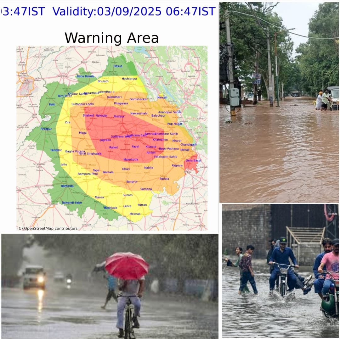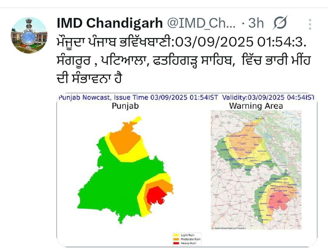 ਇਸ ਸੂਚਨਾ ਤੋਂ ਦੋ ਘੰਟੇ ਪਹਿਲਾਂ ਮੌਸਮ ਵਿਭਾਗ ਨੇ ਮੌਜੂਦਾ ਪੰਜਾਬ ਭਵਿੱਖਬਾਣੀ:03/09/2025 01:54:3. ਅਨੁਸਾਰ ਸੰਗਰੂਰ, ਪਟਿਆਲਾ, ਫਤਹਿਗੜ੍ਹ ਸਾਹਿਬ, ਵਿੱਚ ਭਾਰੀ ਮੀਂਹ ਦੀ ਸੰਭਾਵਨਾ ਵੀ ਪ੍ਰਗਟਾਈ ਹੈ