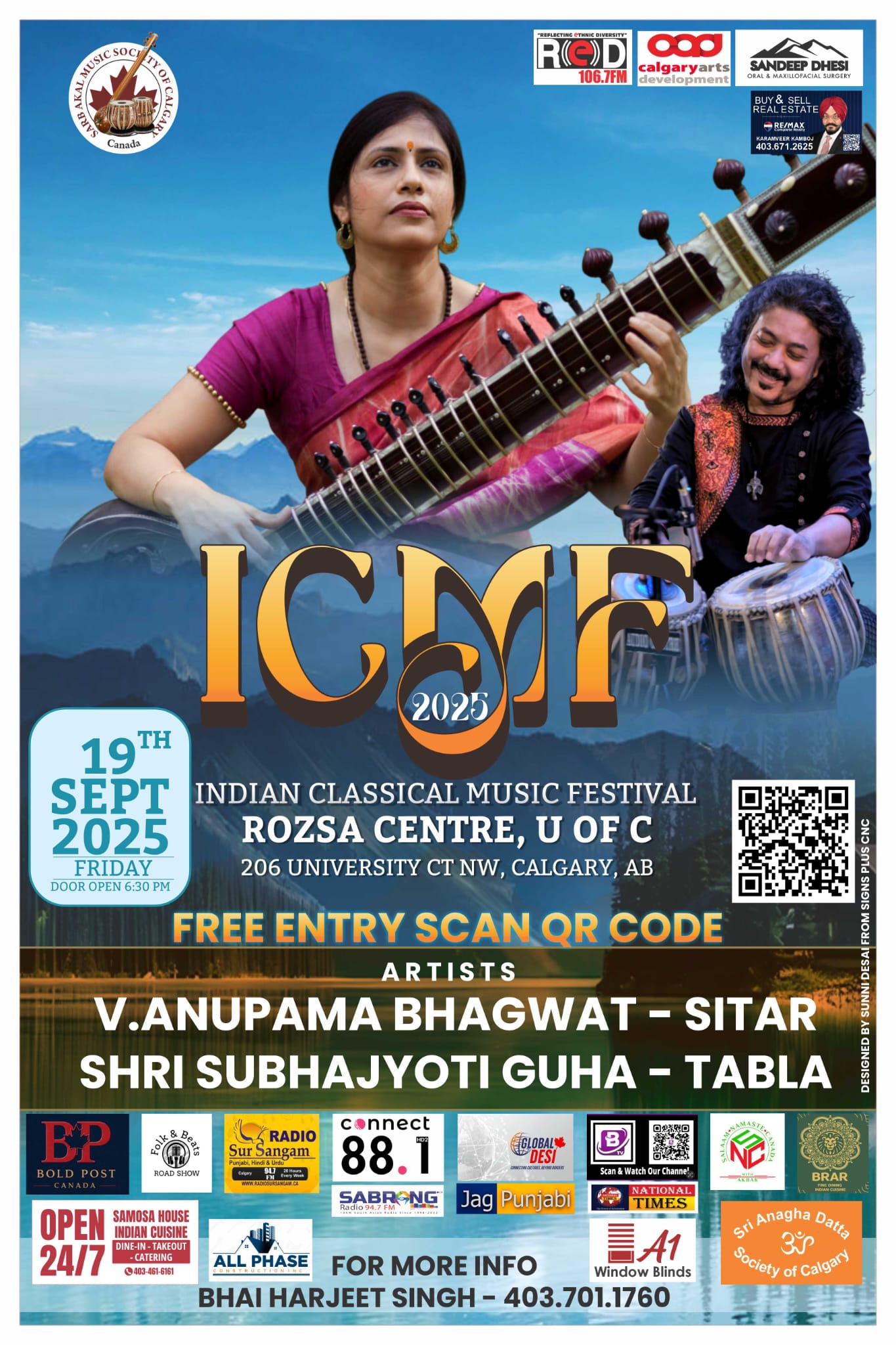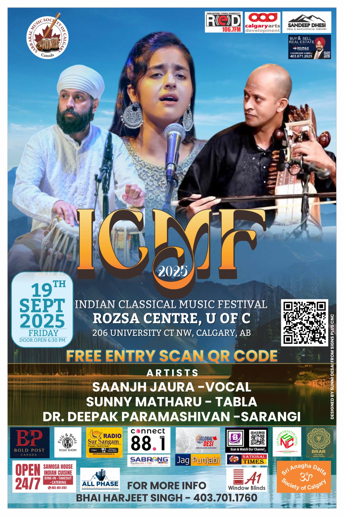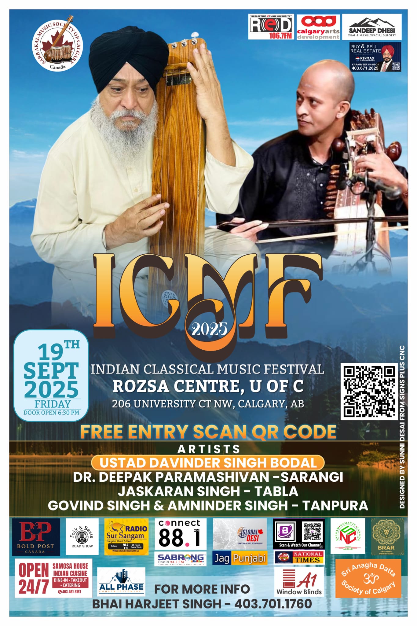 ਕੈਲਗਰੀ, 18 ਸਤੰਬਰ – ਕੈਲਗਰੀ ਦੀ ਸਰਬ ਅਕਾਲ ਸੰਗੀਤ ਸੋਸਾਇਟੀ ਵੱਲੋਂ ਇੰਡੀਅਨ ਕਲਾਸੀਕਲ ਮਿਊਜ਼ਿਕ ਫੈਸਟੀਵਲ (ICMF 2025) ROZSA CENTRE, U OF C 206 UNIVERSITY CT NW, CALGARY, AB  ਵਿਖ਼ੇ ਕਰਵਾਏ ਜਾ ਰਹੇ ਹਨ, 19 ਸਤੰਬਰ ਨੂੰ ਸ਼ਾਮ 6.30 ਵਜੇ ਆਰੰਭ ਹੋ ਰਹੇ ਪ੍ਰੋਗਰਾਮ ਜਿਸ ਵਿੱਚ ਵਿਸ਼ਵ-ਪ੍ਰਸਿੱਧ ਕਲਾਕਾਰ ਆਪਣੀ ਅਦਾਅ ਨਾਲ ਰੂਹ ਨੂੰ ਸਕੂਨ ਦੇਣ ਵਾਲੇ ਸੰਗੀਤ ਪ੍ਰੋਗਰਾਮ ਪੇਸ਼ ਕਰਨਗੇ । ਪ੍ਰੋਗਰਾਮ ਤਿੰਨ ਦਿਨ 19,20ਅਤੇ 21 ਸਤੰਬਰ ਨੂੰ ਕੀਤੇ ਜਾ ਰਹੇ ਹਨ, ਪ੍ਰਬੰਧਕਾਂ ਅਨੁਸਾਰ ਸਰੋਤਿਆਂ ਲਈ ਐਂਟਰੀ ਫ਼ਰੀ ਰੱਖੀ ਗਈ ਹੈ ਚਾਹਵਾਨ QR Code ਸਕੈਨ ਕਰ ਕੇ ਸੀਟ ਲੈ ਸਕਦੇ ਹਨ