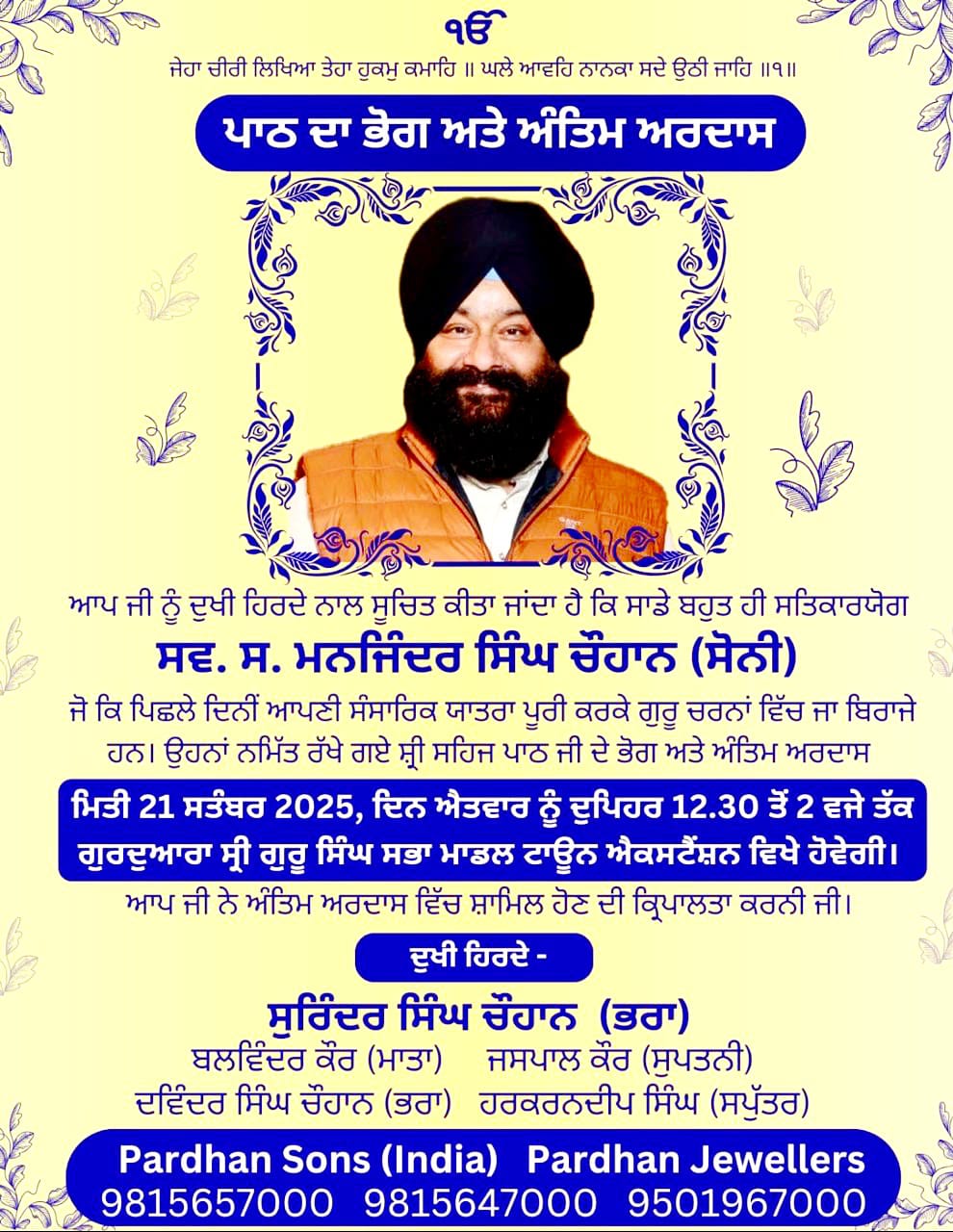 ਲੁਧਿਆਣਾ, 21 ਸਤੰਬਰ -ਅਕਾਲੀ ਆਗੂ ਸ੍ਰ. ਸੁਰਿੰਦਰ ਸਿੰਘ ਚੌਹਾਨ ਦੇ ਛੋਟੇ ਭਰਾਤਾ ਸ. ਮਨਜਿੰਦਰ ਸਿੰਘ ਚੌਹਾਨ (ਸੋਨੀ) ਜੋ ਕਿ ਪਿਛਲੇ ਦਿਨੀਂ ਆਪਣੀ ਸੰਸਾਰਿਕ ਯਾਤਰਾ ਪੂਰੀ ਕਰਕੇ ਗੁਰੂ ਚਰਨਾਂ ਵਿੱਚ ਜਾ ਬਿਰਾਜੇ ਸਨ, ਉਹਨਾਂ ਨਮਿੱਤ ਗੁਰੂ ਗ੍ਰੰਥ ਸਾਹਿਬ ਦੀ ਰੱਬੀ ਬਾਣੀ ਦੇ ਰੱਖੇ ਗਏ ਸਹਿਜ ਪਾਠ ਦੇ ਭੋਗ ਅਤੇ ਅੰਤਿਮ ਅਰਦਾਸ ਅੱਜ ਮਿਤੀ 21 ਸਤੰਬਰ 2025, ਦਿਨ ਐਤਵਾਰ ਨੂੰ ਦੁਪਿਹਰ 12.30 ਤੋਂ 2 ਵਜੇ ਤੱਕ ਗੁਰਦੁਆਰਾ ਸ੍ਰੀ ਗੁਰੂ ਸਿੰਘ ਸਭਾ ਮਾਡਲ ਟਾਊਨ ਐਕਸਟੈਂਸ਼ਨ ਲੁਧਿਆਣਾ ਵਿਖੇ ਹੋਵੇਗੀ।