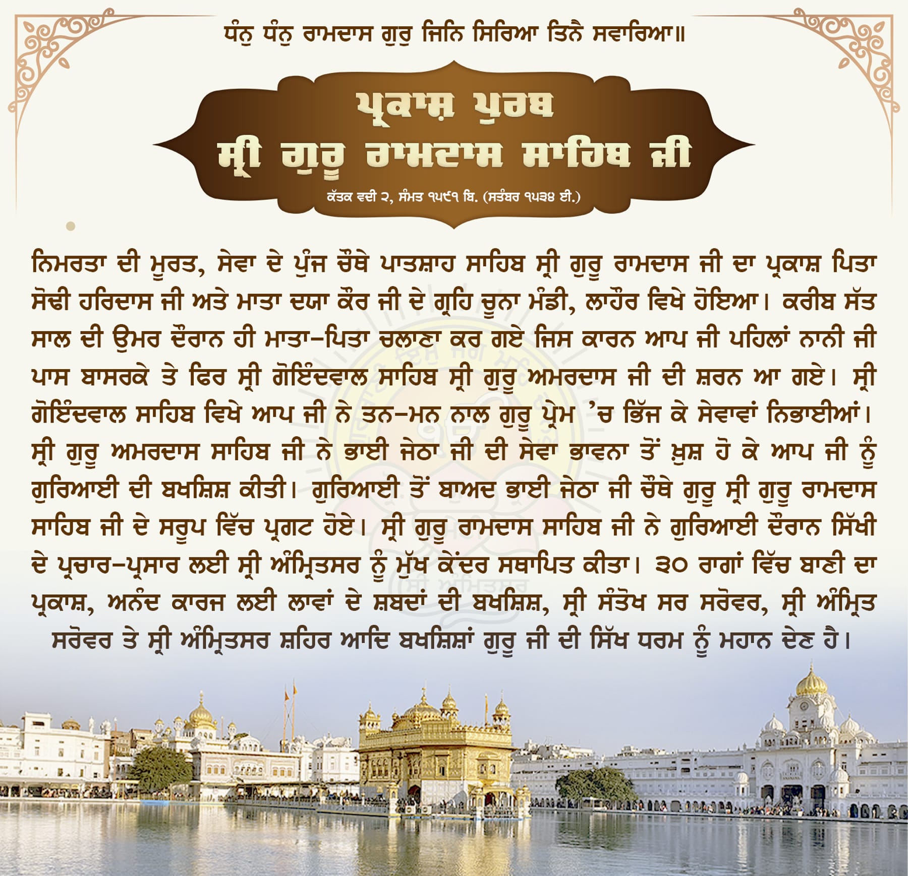 ਇਤਿਹਾਸ : ਪ੍ਰਕਾਸ਼ ਪੁਰਬ ਸ੍ਰੀ ਗੁਰੂ ਰਾਮਦਾਸ ਸਾਹਿਬ ਜੀ