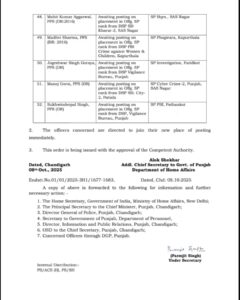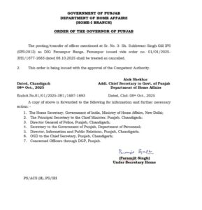 ਪੰਜਾਬ, ਮੁੱਖ ਖ਼ਬਰਾਂ ਪੰਜਾਬ ਵਿੱਚ ਵੱਡਾ ਪ੍ਰਸ਼ਾਸਨਿਕ ਫੇਰਬਦਲ, 4 IPS ਅਧਿਕਾਰੀਆਂ ਸਣੇ 52 ਅਧਿਕਾਰੀਆਂ ਦੇ ਤਬਾਦਲੇ October 9, 2025 ਨਿਊਜ਼ ਪੰਜਾਬ 9 ਅਕਤੂਬਰ 2025 ਪੰਜਾਬ ਸਰਕਾਰ ਨੇ ਬੁੱਧਵਾਰ ਨੂੰ ਪੁਲਿਸ ਵਿਭਾਗ ਵਿੱਚ ਵੱਡਾ ਫੇਰਬਦਲ ਕੀਤਾ ਹੈ। ਚਾਰ ਆਈਪੀਐਸ ਸਮੇਤ 52 ਪੁਲਿਸ ਅਧਿਕਾਰੀਆਂ ਦੇ ਤਬਾਦਲੇ ਕੀਤੇ ਗਏ ਹਨ।