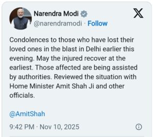 ਦੇਸ਼ ਦੀ ਰਾਜਧਾਨੀ ਦਿੱਲੀ ਦੇ ਲਾਲ ਕਿਲ੍ਹਾ ਮੈਟਰੋ ਸਟੇਸ਼ਨ ਨੇੜੇ ਹੋਏ ਧਮਾਕੇ ਨੂੰ ਲੈ ਕੇ ਪ੍ਰਧਾਨ ਮੰਤਰੀ ਨਰਿੰਦਰ ਮੋਦੀ ਨੇ  X ‘ਤੇ ਪੋਸਟ ਕੀਤੀ ਅਤੇ ਧਮਾਕੇ ਵਿੱਚ ਜਾਨਾਂ ਗੁਆਉਣ ਵਾਲਿਆਂ ਦੇ ਪਰਿਵਾਰਾਂ ਪ੍ਰਤੀ ਸੰਵੇਦਨਾ ਪ੍ਰਗਟ ਕੀਤੀ । ਉਨ੍ਹਾਂ ਨੇ ਕਿਹਾ, “ਅਧਿਕਾਰੀ ਇਸ ਧਮਾਕੇ ਤੋਂ ਪ੍ਰਭਾਵਿਤ ਲੋਕਾਂ ਦੀ ਮਦਦ ਕਰ ਰਹੇ ਹਨ। ਗ੍ਰਹਿ ਮੰਤਰੀ ਅਮਿਤ ਸ਼ਾਹ ਨੇ ਹੋਰ ਅਧਿਕਾਰੀਆਂ ਨਾਲ ਸਥਿਤੀ ਦੀ ਸਮੀਖਿਆ ਕੀਤੀ।”