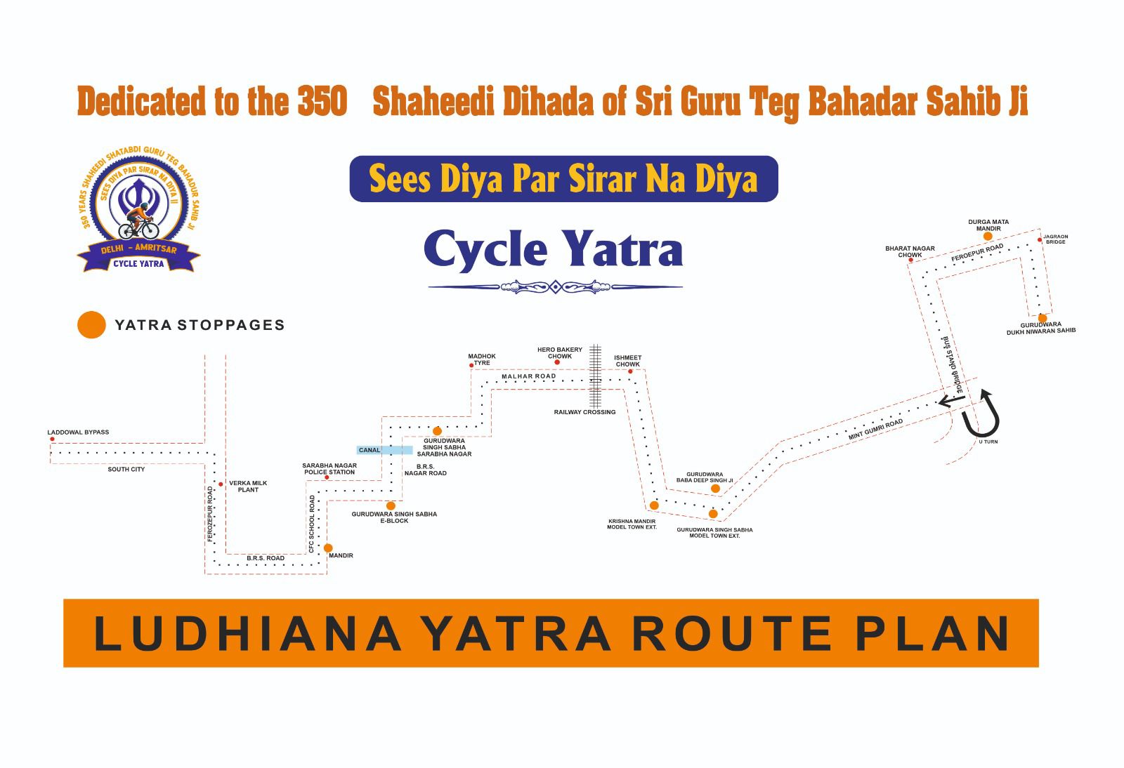 ਗੁ: ਦੂਖ ਨਿਵਾਰਨ ਸਾਹਿਬ ਲੁਧਿਆਣਾ ਵਿਖੇ ਵਿਸ਼ਰਾਮ ਕਰੇਗੀ ਅਤੇ 18 ਨਵੰਬਰ ਨੂੰ ਸਵੇਰੇ 7 am ਵਜੇ ਅਗਲੇ ਪੜਾਅ ਲਈ ਰਵਾਨਾ ਹੋਵੇਗੀ ਇਸ ਸਬੰਧੀ ਜਾਣਕਾਰੀ ਦੇਂਦਿਆਂ ਸ੍ਰ. ਭੁਪਿੰਦਰ ਸਿੰਘ ਭਿੰਦਾ ਪ੍ਰਧਾਨ ਅਕਾਲੀ ਜੱਥਾ ਲੁਧਿਆਣਾ ਸ਼ਹਿਰੀ ਅਨੁਸਾਰ ਸਾਈਕਲ ਯਾਤਰਾ ਗੁਰਦੁਆਰਾ ਸੀਸਗੰਜ ਸਾਹਿਬ ਦਿੱਲੀ ਤੋਂ ਸਰਦਾਰ ਮਨਜੀਤ ਸਿੰਘ ਜੀਕੇ ਦੀ ਅਗਵਾਈ ਦੇ ਵਿੱਚ 15 ਨਵੰਬਰ ਨੂੰ ਆਰੰਭ ਹੋਈ ਸੀ ਜੋ ਕਿ ਵੱਖ ਵੱਖ ਸ਼ਹਿਰਾਂ ਚੋਂ ਹੁੰਦੀ ਹੋਈ ਸ੍ਰੀ ਅੰਮ੍ਰਿਤਸਰ ਸਾਹਿਬ ਗੁਰੂ ਕੇ ਮਹਿਲ ਵਿਖੇ 20 ਤਰੀਕ ਨੂੰ ਪਹੁੰਚਣੀ ਹੈ । ਇਹ ਸਾਈਕਲ ਯਾਤਰਾ 17 ਨਵੰਬਰ ਰਾਤ ਨੂੰ ਗੁ: ਦੂਖ ਨਿਵਾਰਨ ਸਾਹਿਬ ਲੁਧਿਆਣਾ ਵਖੇ ਵਿਸ਼ਰਾਮ ਕਰੇਗੀ ਅਤੇ 18 ਨਵੰਬਰ ਨੂੰ ਸਵੇਰੇ 7 am ਵਜੇ ਆਰੰਭ ਹੋਵੇਗੀ ਅਤੇ ਹੇਠ ਦਿੱਤੇ ਨਕਸ਼ੇ ਅਨੁਸਾਰ