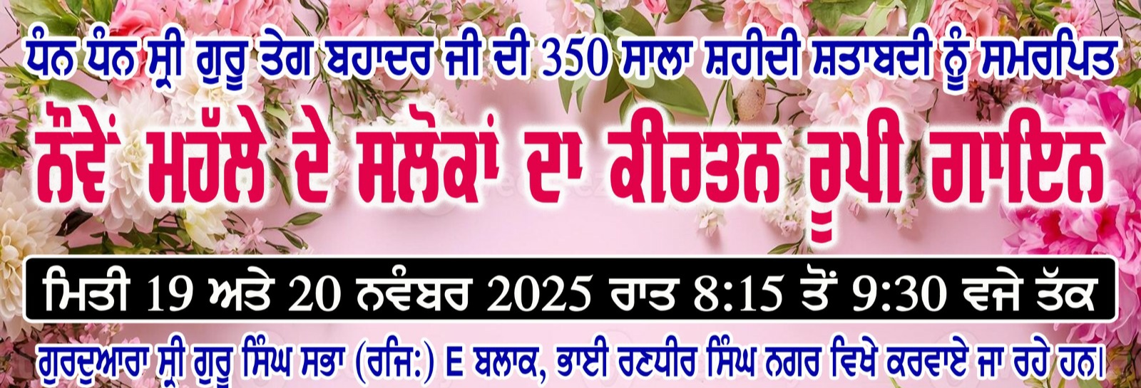 ਲੁਧਿਆਣਾ, 18 ਨਵੰਬਰ – ਧੰਨ ਧੰਨ ਸ੍ਰੀ ਗੁਰੂ ਤੇਗ ਬਹਾਦਰ ਜੀ ਦੀ 350 ਸਾਲਾ ਸ਼ਹੀਦੀ ਸ਼ਤਾਬਦੀ ਨੂੰ ਸਮਰਪਿਤ ਨੌਵੇਂ ਮੁਹੱਲੇ ਦੇ ਸਲੋਕਾਂ ਦਾ ਕੀਰਤਨ ਰੂਪੀ ਗਾਇਨ ਮਿਤੀ 19 ਅਤੇ 20 ਨਵੰਬਰ 2025 ਰਾਤ 8:15 ਤੋਂ 9:30 ਵਜੇ ਤੱਕ ਗੁਰਦੁਆਰਾ ਸ੍ਰੀ ਗੁਰੂ ਸਿੰਘ ਸਭਾ (ਰਜਿ:) E ਬਲਾਕ, ਭਾਈ ਰਣਧੀਰ ਸਿੰਘ ਨਗਰ ਵਿਖੇ ਕਰਵਾਏ ਜਾ ਰਹੇ ਹਨ।
