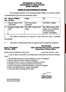 ਪੰਜਾਬ ਸਰਕਾਰ ਲਗਾਤਾਰ ਪੁਲਿਸ ਅਧਿਕਾਰੀਆਂ ਦੇ ਤਬਾਦਲੇ ਕਰ ਰਹੀ ਹੈ। ਜਲੰਧਰ ਪੁਲਿਸ ਵਿਭਾਗ ਵਿਚ ਪ੍ਰਸ਼ਾਸਕੀ ਫੇਰਬਦਲ ਦੇ ਹਿੱਸੇ ਵਜੋਂ ਜਲੰਧਰ ਦੇ ਡੀ.ਸੀ.ਪੀ. ਨਰੇਸ਼ ਡੋਗਰਾ ਦਾ ਤਬਾਦਲਾ ਕੀਤਾ ਗਿਆ ਹੈ। ਉਨ੍ਹਾਂ ਨੂੰ ਏ.ਆਈ.ਜੀ., ਸਟੇਟ ਸਪੈਸ਼ਲ ਆਪ੍ਰੇਸ਼ਨ ਸੈੱਲ, ਫ਼ਾਜ਼ਿਲਕਾ ਨਿਯੁਕਤ ਕੀਤਾ ਗਿਆ ਹੈ।