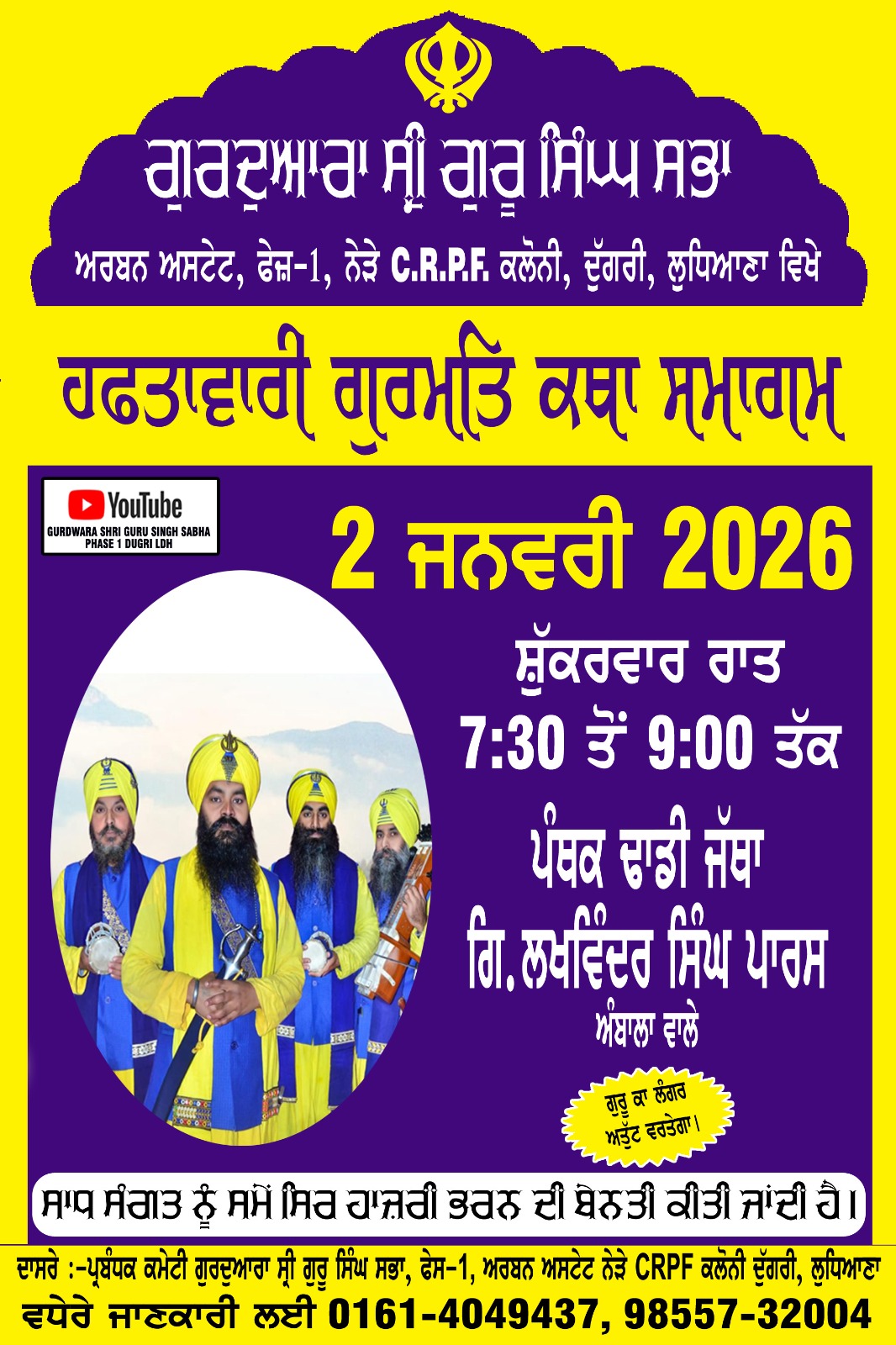 ਗੁਰੂਦੁਆਰਾ ਸ੍ਰੀ ਗੁਰੂ ਸਿੰਘ ਸਭਾ ਅਰਬਨ ਅਸਟੇਟ ਫੇਸ 1 ਵਿਖ਼ੇ ਅੱਜ 2 ਜਨਵਰੀ 2026 ਸ਼ੁੱਕਰਵਾਰ ਰਾਤ 7:30 में 9:00 ਤੱਕ ਪ੍ਰਸਿੱਧ ਪੰਥਕ ਢਾਡੀ ਜੱਥਾ ਗਿ. ਲਖਵਿੰਦਰ ਸਿੰਘ ਪਾਰਸ ਅੰਬਾਲਾ ਵਾਲੇ ਸੰਗਤਾਂ ਨੂੰ ਗੁਰੂ ਇਤਿਹਾਸ ਨਾਲ ਜੋੜਨਗੇ – ਕੁਲਵਿੰਦਰ ਸਿੰਘ ਬੈਨੀਪਾਲ