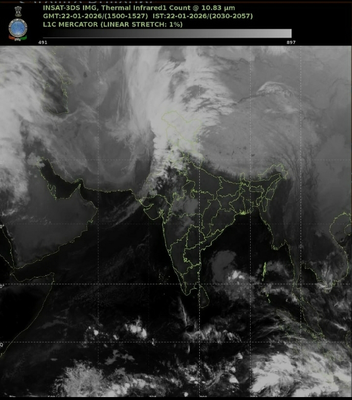 , INSAT-3DS Thermal Infrared ਸੈਟੇਲਾਈਟ ਤਸਵੀਰ ਜੋ IMD ਵੱਲੋਂ ਜ਼ਾਰੀ ਕੀਤੀ ਗਈ ਹੈ (22 ਜਨਵਰੀ 2026, ਰਾਤ ਕਰੀਬ 8:30–9 ਵਜੇ IST) ਦੇ ਆਧਾਰ ’ਤੇ ਤਾਜ਼ਾ ਮੌਸਮੀ ਸਥਿਤੀ ਹੇਠਾਂ ਸਪਸ਼ਟ ਤੌਰ ’ਤੇ ਸਮਝੋ 👇