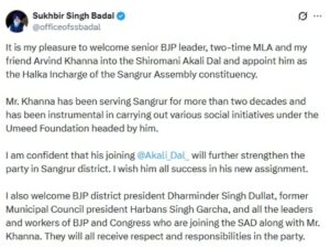 ਸੁਖਬੀਰ ਬਾਦਲ ਨੇ ਕਿਹਾ ਕਿ ਉਨ੍ਹਾਂ ਨੂੰ ਪੂਰਾ ਵਿਸ਼ਵਾਸ ਹੈ ਕਿ ਅਰਵਿੰਦ ਖੰਨਾ ਦਾ ਅਕਾਲੀ ਦਲ ‘ਚ ਸ਼ਾਮਿਲ ਹੋਣਾ ਸੰਗਰੂਰ ਜ਼ਿਲ੍ਹੇ ਵਿੱਚ ਪਾਰਟੀ ਨੂੰ ਹੋਰ ਮਜ਼ਬੂਤੀ ਦੇਵੇਗਾ। ਉਨ੍ਹਾਂ ਨੇ ਖੰਨਾ ਦੇ ਨਵੇਂ ਕਾਰਜਕਾਲ ਲਈ ਸ਼ੁਭਕਾਮਨਾਵਾਂ ਵੀ ਦਿੱਤੀਆਂ।