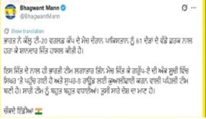 ਮੁੱਖ ਮੰਤਰੀ ਭਗਵੰਤ ਮਾਨ ਨੇ ਪਾਕਿ ਖਿਲਾਫ ਸ਼ਾਨਦਾਰ ਜਿੱਤ ਲਈ ਟੀਮ ਇੰਡੀਆ ਨੂੰ ਵਧਾਈ ਦਿੱਤੀ।