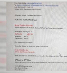 ਮੇਲ ਵਿੱਚ ਦਾਅਵਾ ਕੀਤਾ ਗਿਆ ਕਿ ਮੁੱਖ ਮੰਤਰੀ ਭਗਵੰਤ ਮਾਨ ਨਿਸ਼ਾਨੇ ’ਤੇ ਹਨ ਅਤੇ ਪੰਜਾਬ ਨੂੰ ਖਾਲਿਸਤਾਨ ਬਣਾਉਣ ਦੀ ਗੱਲ ਵੀ ਲਿਖੀ ਗਈ ਹੈ। ਨਾਲ ਹੀ 14 ਅਪ੍ਰੈਲ ਤੱਕ ਡਾ. ਬੀ.ਆਰ. ਅੰਬੇਡਕਰ ਦੇ ਬੁੱਤ ਹਟਾਉਣ ਦੀ ਧਮਕੀ ਦਿੱਤੀ ਗਈ ਹੈ, ਨਹੀਂ ਤਾਂ ਉਨ੍ਹਾਂ ਨੂੰ ਬੰਬ ਨਾਲ ਉਡਾਉਣ ਦੀ ਚੇਤਾਵਨੀ ਦਿੱਤੀ ਗਈ। ਮੇਲ ਵਿੱਚ ਧਮਾਕਿਆਂ ਦੇ ਸਮੇਂ ਦਾ ਵੀ ਜ਼ਿਕਰ ਕੀਤਾ ਗਿਆ ਹੈ—ਸਕੂਲਾਂ ਵਿੱਚ 1:11 ਵਜੇ, ਵਿਧਾਨ ਸਭਾ ਵਿੱਚ 2:11 ਵਜੇ ਅਤੇ ਦਿੱਲੀ ਜਾਣ ਵਾਲੀ ਟ੍ਰੇਨ ਵਿੱਚ 9:11 ਵਜੇ ਧਮਾਕੇ ਕਰਨ ਦੀ ਗੱਲ ਕਹੀ ਗਈ ਹੈ। ਪੁਲਿਸ ਅਤੇ ਸੁਰੱਖਿਆ ਏਜੰਸੀਆਂ ਮਾਮਲੇ ਦੀ ਜਾਂਚ ਕਰ ਰਹੀਆਂ ਹਨ ਅਤੇ ਸੁਰੱਖਿਆ ਪ੍ਰਬੰਧ ਵਧਾ ਦਿੱਤੇ ਗਏ ਹਨ।