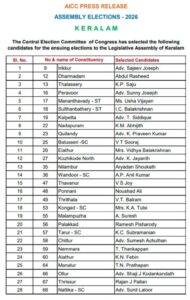 ਕੇਰਲ ਚੋਣਾਂ 2026: ਕਾਂਗਰਸ ਵੱਲੋਂ 55 ਉਮੀਦਵਾਰਾਂ ਦੀ ਪਹਿਲੀ ਲਿਸਟ ਜਾਰੀ