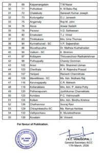 ਕੇਰਲ ਵਿਧਾਨ ਸਭਾ ਚੋਣਾਂ 2026 ਲਈ ਕਾਂਗਰਸ ਪਾਰਟੀ ਨੇ 55 ਉਮੀਦਵਾਰਾਂ ਦੀ ਆਪਣੀ ਪਹਿਲੀ ਸੂਚੀ ਜਾਰੀ ਕਰ ਦਿੱਤੀ ਹੈ। ਇਸ ਸੂਚੀ ਵਿੱਚ ਸੂਬਾ ਪ੍ਰਧਾਨ ਸੰਨੀ ਜੋਸਫ਼ ਨੂੰ ਪੇਰਾਵੂਰ, ਵਿਰੋਧੀ ਧਿਰ ਦੇ ਨੇਤਾ ਵੀ.ਡੀ. ਸਤੀਸਨ ਨੂੰ ਪਰਾਵੂਰ ਅਤੇ ਰਮੇਸ਼ ਚੇਨੀਥਲਾ ਨੂੰ ਹਰੀਪਦ ਤੋਂ ਮੈਦਾਨ ਵਿੱਚ ਉਤਾਰਿਆ ਗਿਆ ਹੈ। ਇਸ ਤੋਂ ਇਲਾਵਾ ਰਾਮਿਆ ਹਰੀਦਾਸ ਨੂੰ ਚਿਰਾਇਨਕੀਝੂ ਅਤੇ ਕੇ. ਮੁਰਲੀਧਰਨ ਨੂੰ ਵੱਟਿਊਰਕਾਵੂ ਤੋਂ ਟਿਕਟ ਦਿੱਤੀ ਗਈ ਹੈ, ਜਦਕਿ ਸਾਬਕਾ ਮੁੱਖ ਮੰਤਰੀ ਓਮਨ ਚਾਂਡੀ ਦੇ ਪੁੱਤਰ ਚਾਂਡੀ ਓਮਨ ਨੂੰ ਪੁਥੁਪੱਲੀ ਤੋਂ ਦੁਬਾਰਾ ਉਮੀਦਵਾਰ ਬਣਾਇਆ ਗਿਆ ਹੈ।