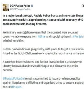 ਪੰਜਾਬ ਪੁਲੀਸ ਦੀ ਪਟਿਆਲਾ ਇਕਾਈ ਨੇ ਵੱਡੀ ਸਫਲਤਾ ਹਾਸਿਲ ਕਰਦਿਆਂ ਇੱਕ ਅੰਤਰ-ਰਾਜੀ ਗੈਰ-ਕਾਨੂੰਨੀ ਹਥਿਆਰ ਸਪਲਾਈ ਮਾਡਿਊਲ ਦਾ ਪਰਦਾਫਾਸ਼ ਕੀਤਾ ਹੈ। ਇਸ ਕਾਰਵਾਈ ਦੌਰਾਨ 4 ਦੋਸ਼ੀਆਂ ਨੂੰ ਗ੍ਰਿਫ਼ਤਾਰ ਕਰਕੇ 10 ਅਧੁਨਿਕ ਸੈਲਫ-ਲੋਡਿੰਗ ਹਥਿਆਰ ਬਰਾਮਦ ਕੀਤੇ ਗਏ ਹਨ। ਇਸ ਸੰਬੰਧੀ ਜਾਣਕਾਰੀ Gaurav Yadav ਵੱਲੋਂ ਸਾਂਝੀ ਕੀਤੀ ਗਈ ਹੈ।